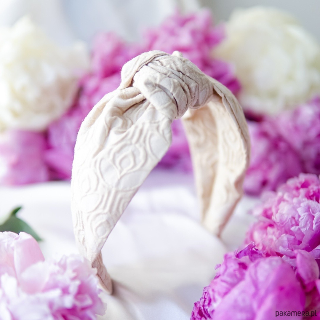 Wyobraź sobie filiżankę latte z delikatną pianką – właśnie taki, kremowo-piaskowy odcień przybrała ta opaska. Wykonana z naturalnej bawełny żakardowej, zdobionej subtelnie wypukłym motywem kwiatów przypominających płatki zamrożone w porcelanie, zachwyca fakturą widoczną i z daleka, i pod palcami. Materiał nie został podszyty od spodu: bezpośredni kontakt miękkiej bawełny ze skórą głowy sprawia, że opaska oddycha i błyskawicznie dostosowuje się do ciepła ciała – niewyczuwalna nawet po wielu godzinach.