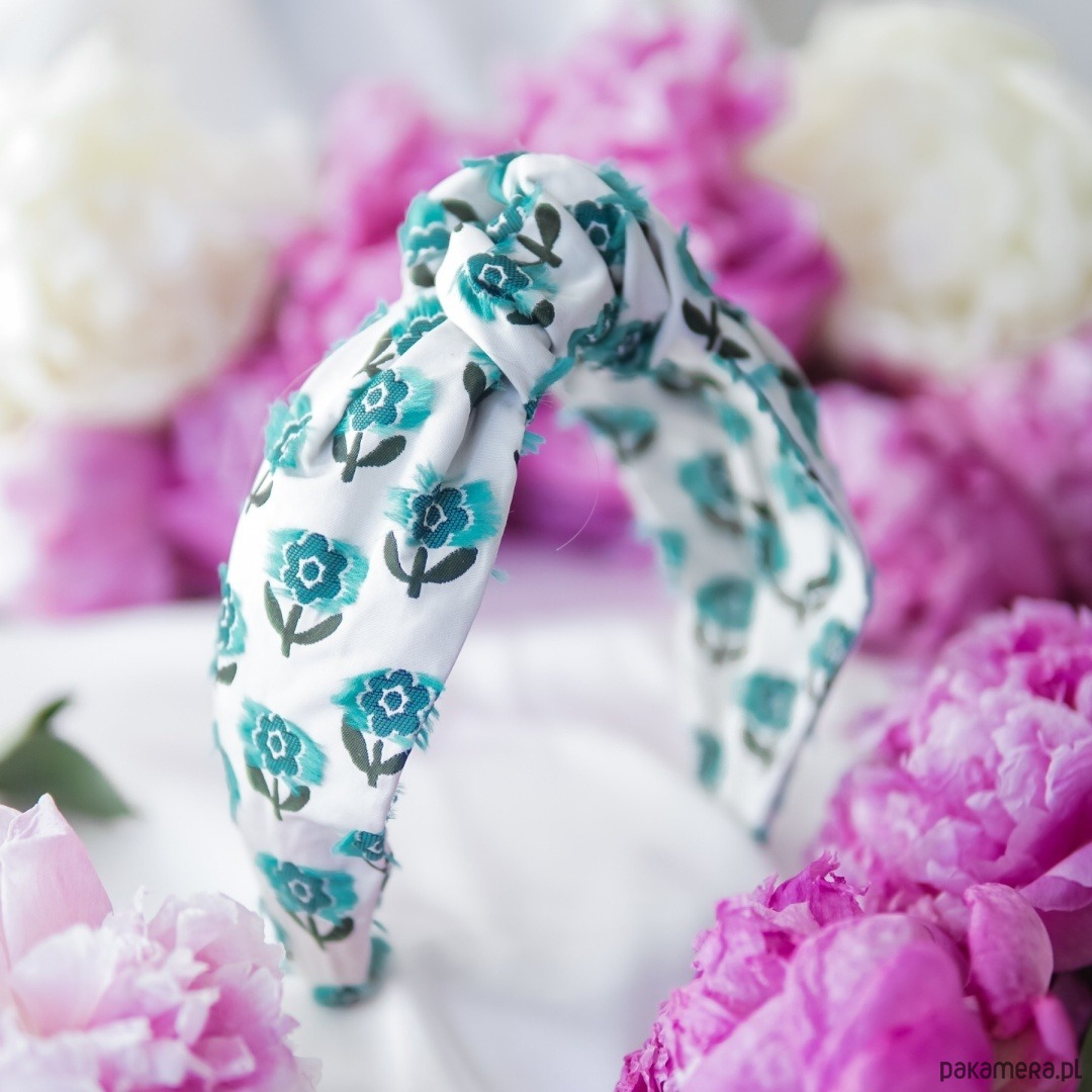 Opaska została zbudowana na lekkiej, plastikowej bazie o szerokości 3 cm, którą otula miękka tkanina, ona odpowiada za niewielkie uniesienie niczym delikatna korona, ale jednocześnie nie uciska skroni nawet przy całodniowym noszeniu. Centralny węzeł skupia materiał, pięknie eksponując relief kwiatów, a zebrane po bokach „skrzydełka” dodają fryzurze objętości i uroku.