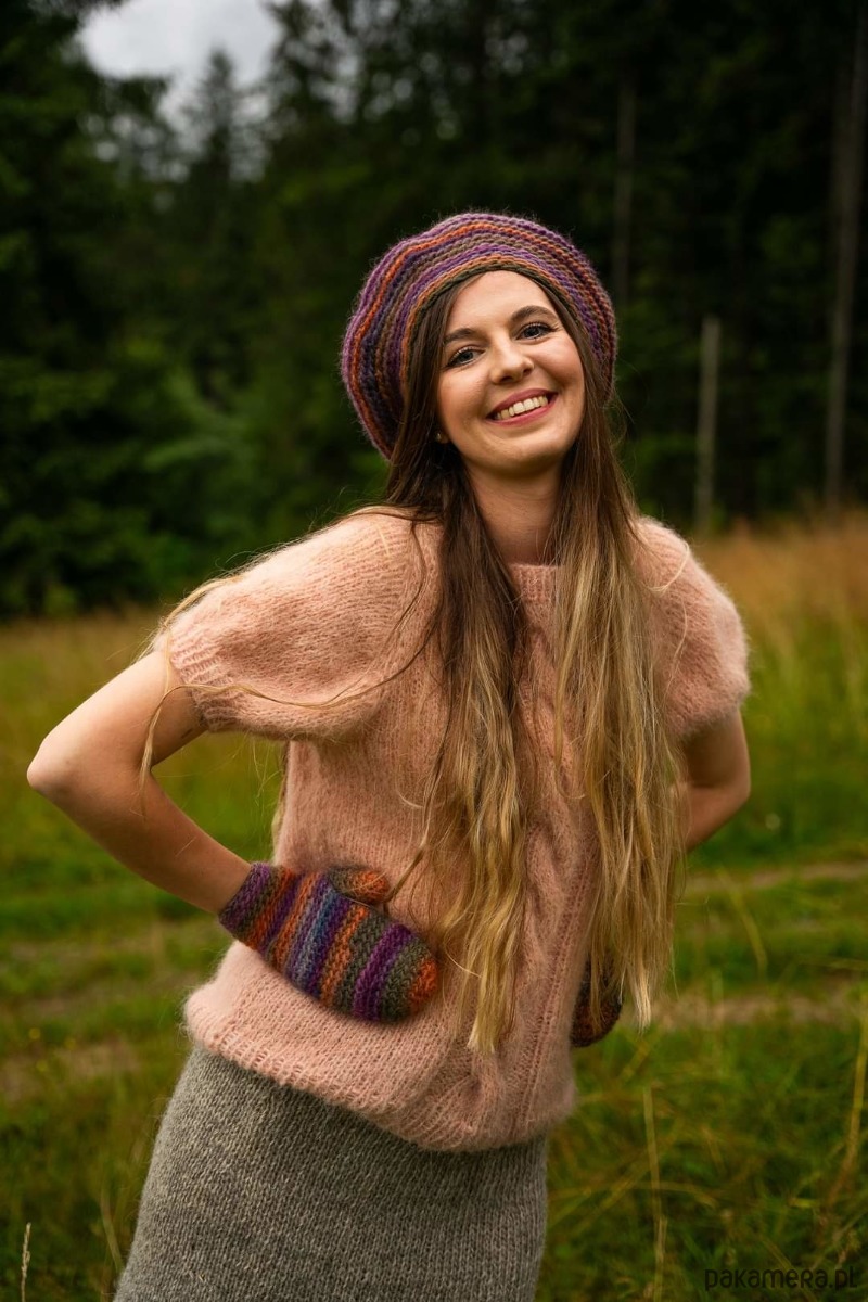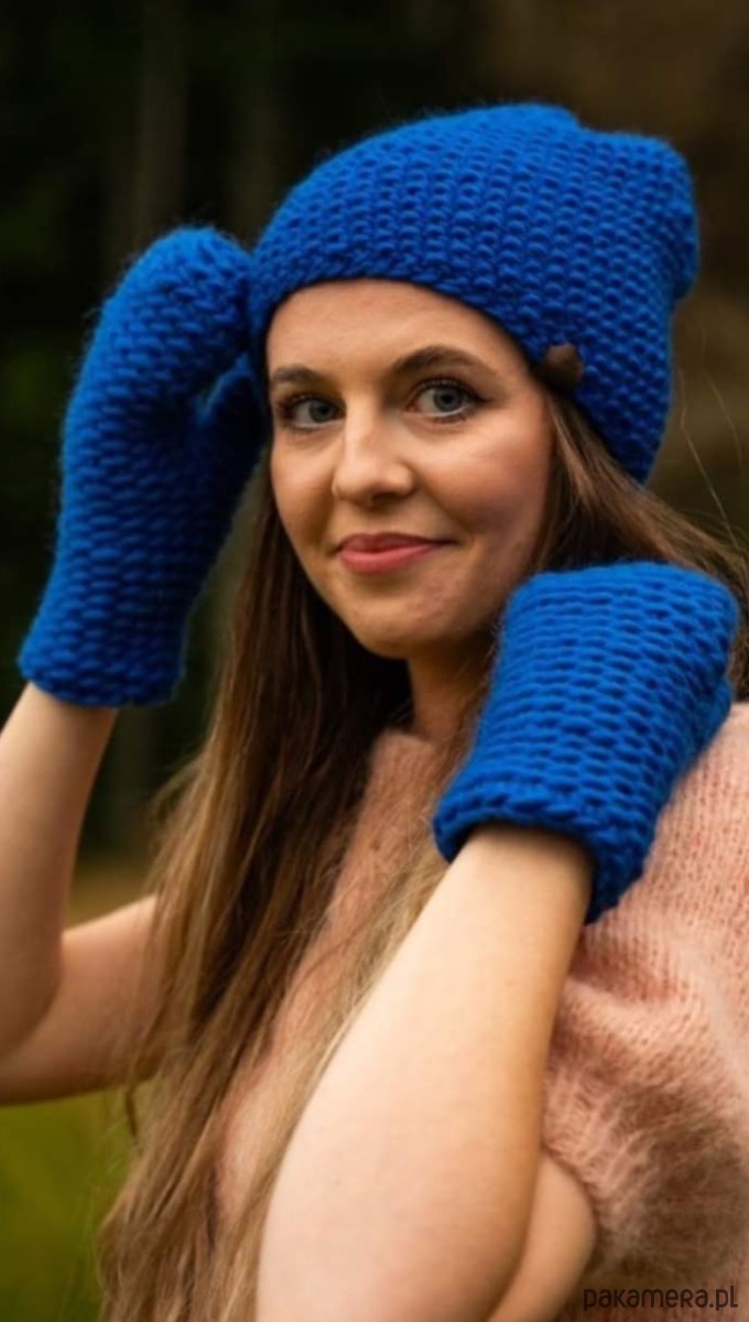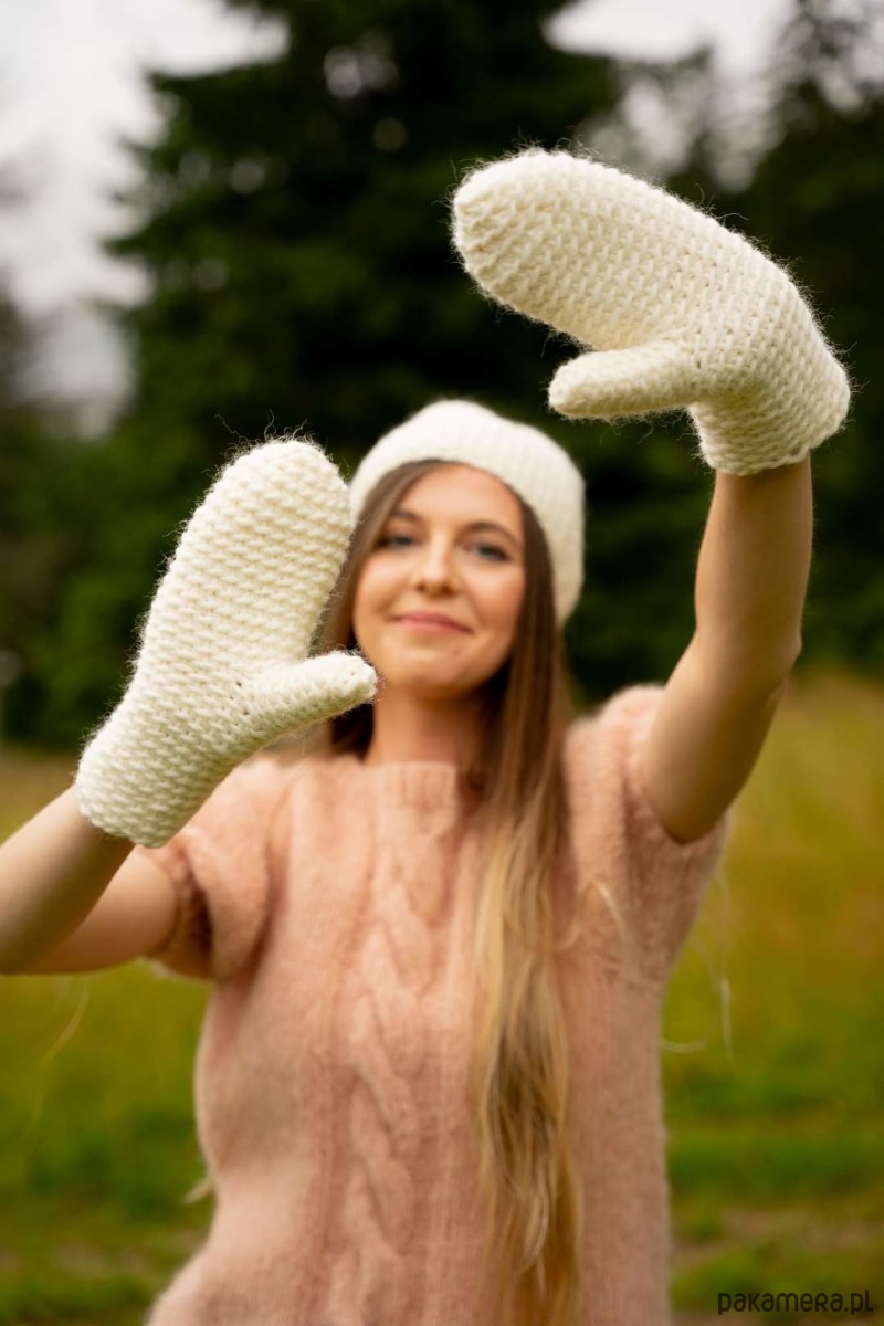Rękawiczki wykonane ręcznie w 100% z wełny. Ciepłe uniwersalne. Można dopasować czapeczkę lub opaskę w takim samym kolorze.