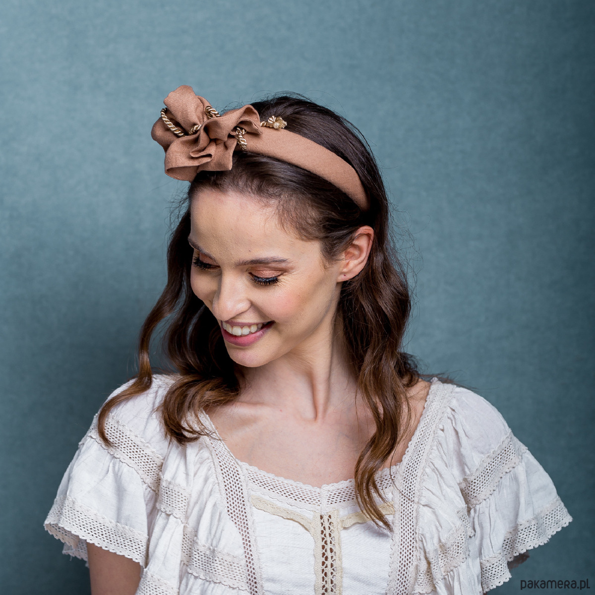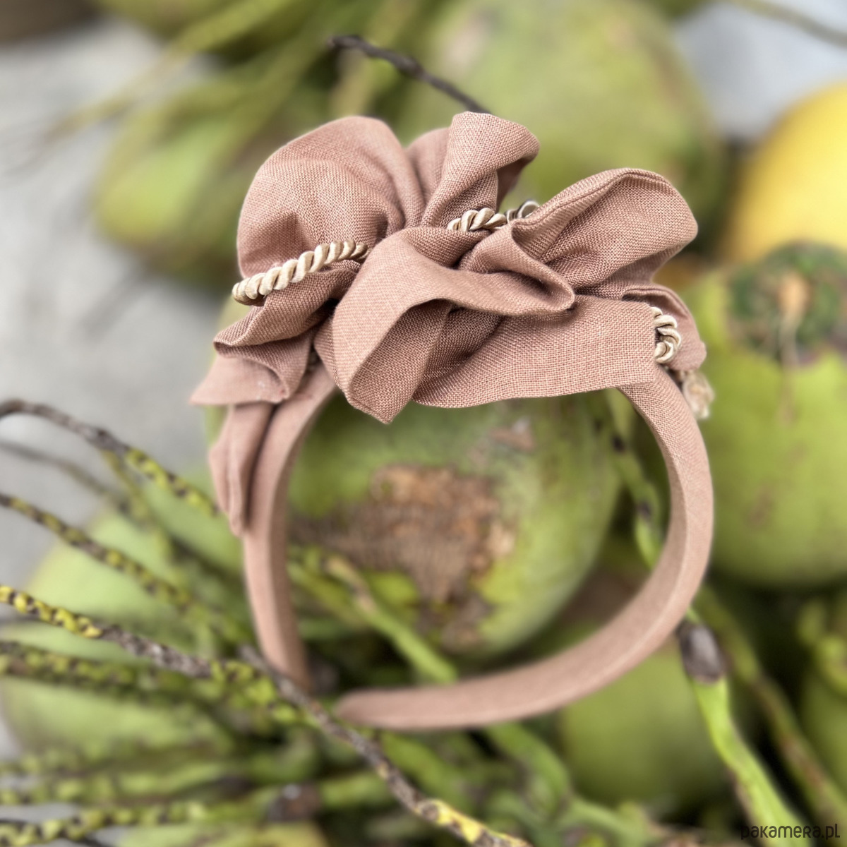 Opaska z naszej kolekcji boho to świetny dodatek do włosów na lato. Tkanina i sznurek, który zdobi opaskę to naturalne materiały, które idealnie komponują się z kreacjami boho. Posiada sporą wachlarzową ozdobę ze sznurem, zwraca na siebie uwagę oryginalną formą. Ma piękny odcień nudziakowego opalonego beżu. Jest wyjątkowo twarzowa i świetnie zgrywa się z rozwianym włosem :). Wspaniale akcentuje stylizację.