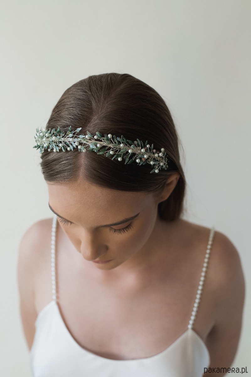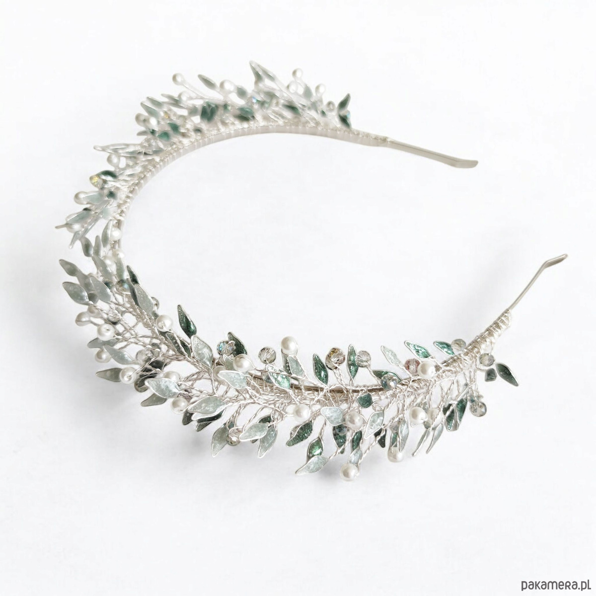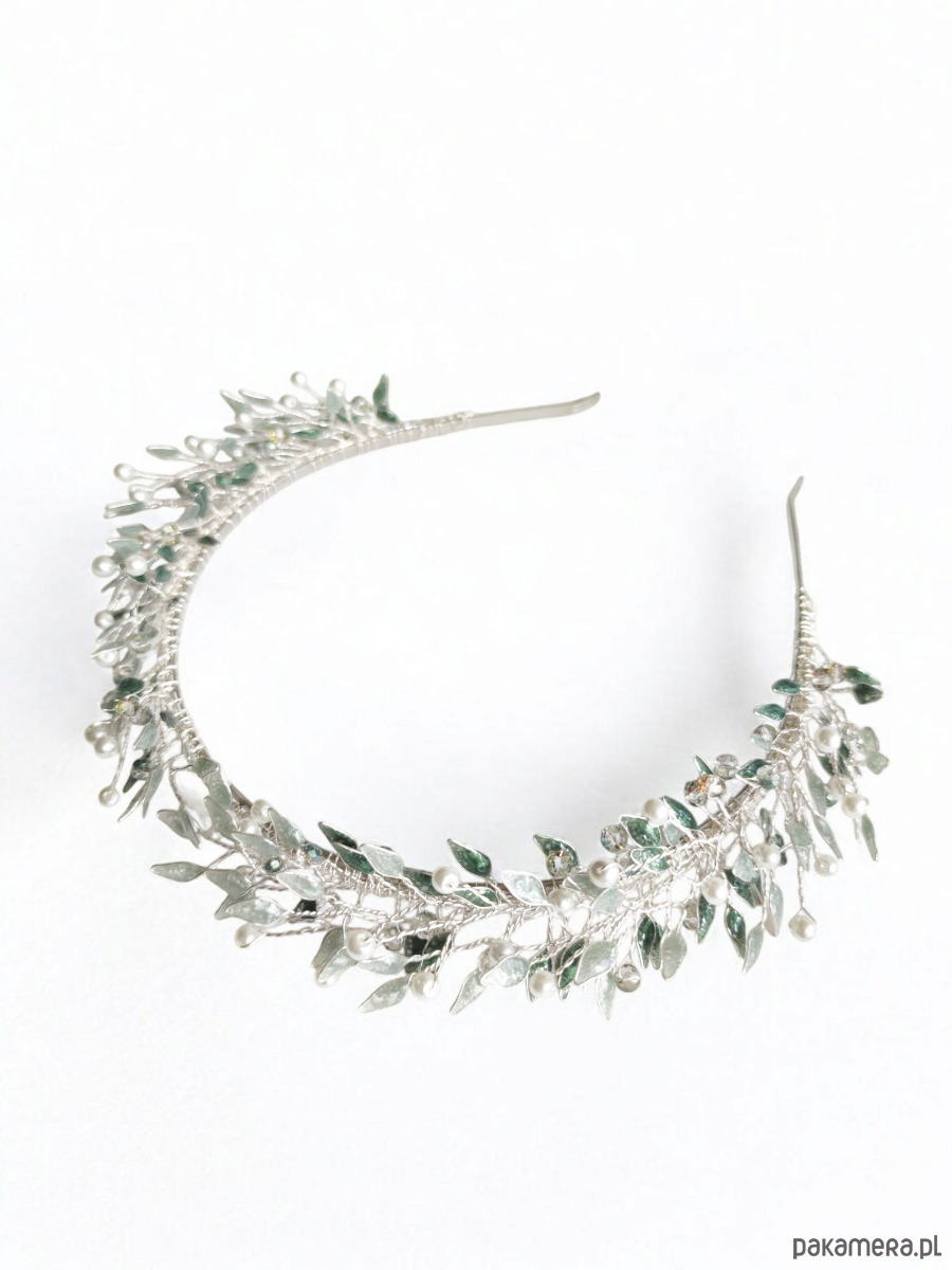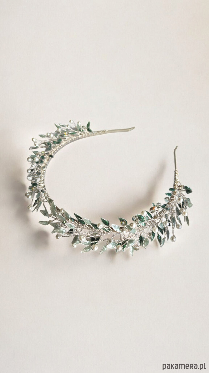 Opaska z setek maleńkich listków ręcznie formowanych w kolorach butelkowej i szałwiowej zieleni. Baza i drut jubilerski w kolorze srebrnym. Blasku dodają gałazki ze szklanymi białymi perłami . Idealna do stylu klasycznego i Boho.