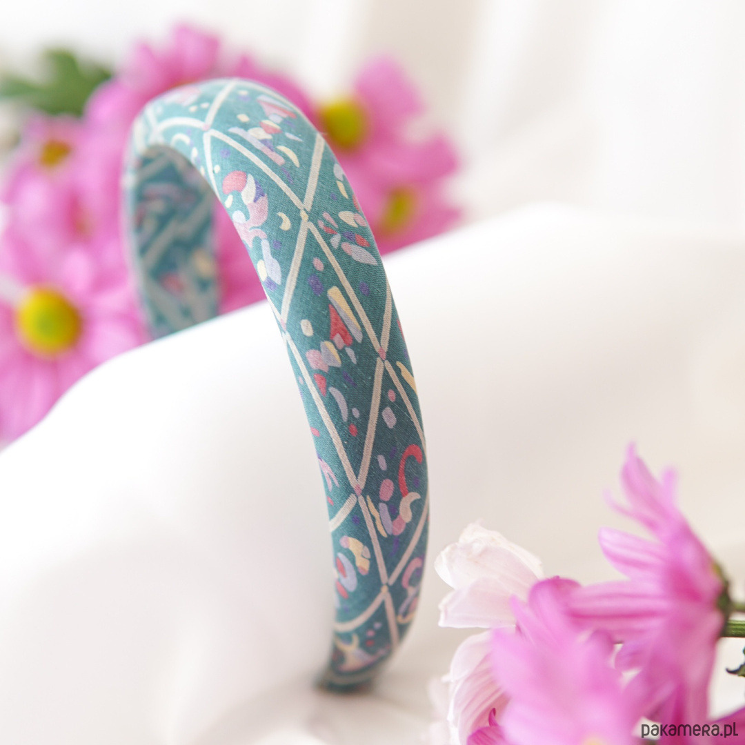 Opaska na włosy stworzona z jedwabnego, męskiego krawata. Tkanina jest wyjątkowo wzorzysta i delikatna. Model ozdoby na włosy w niecodziennym wydaniu. Lekka i wygodna opaska na głowę dla kobiet, które chcą podkreślić swoją fryzurę. Opaska jest w uniwersalnym rozmiarze, dopasowuje się do kształtu głowy. Została stworzona na gotowej wyprasce o szerokości 3 cm. Bardzo miękka gąbka powoduje, że opaska odstaje od głowy na wysokość ok. 0,5 cm. Daje to efekt tiary lub delikatnej korony. Pasuje kobietom o długich i krótkich włosach. Sprawdzi się w niedbałych koczkach, kucykach oraz warkoczach. Urozmaici fryzury wieczorowe i codzienne.