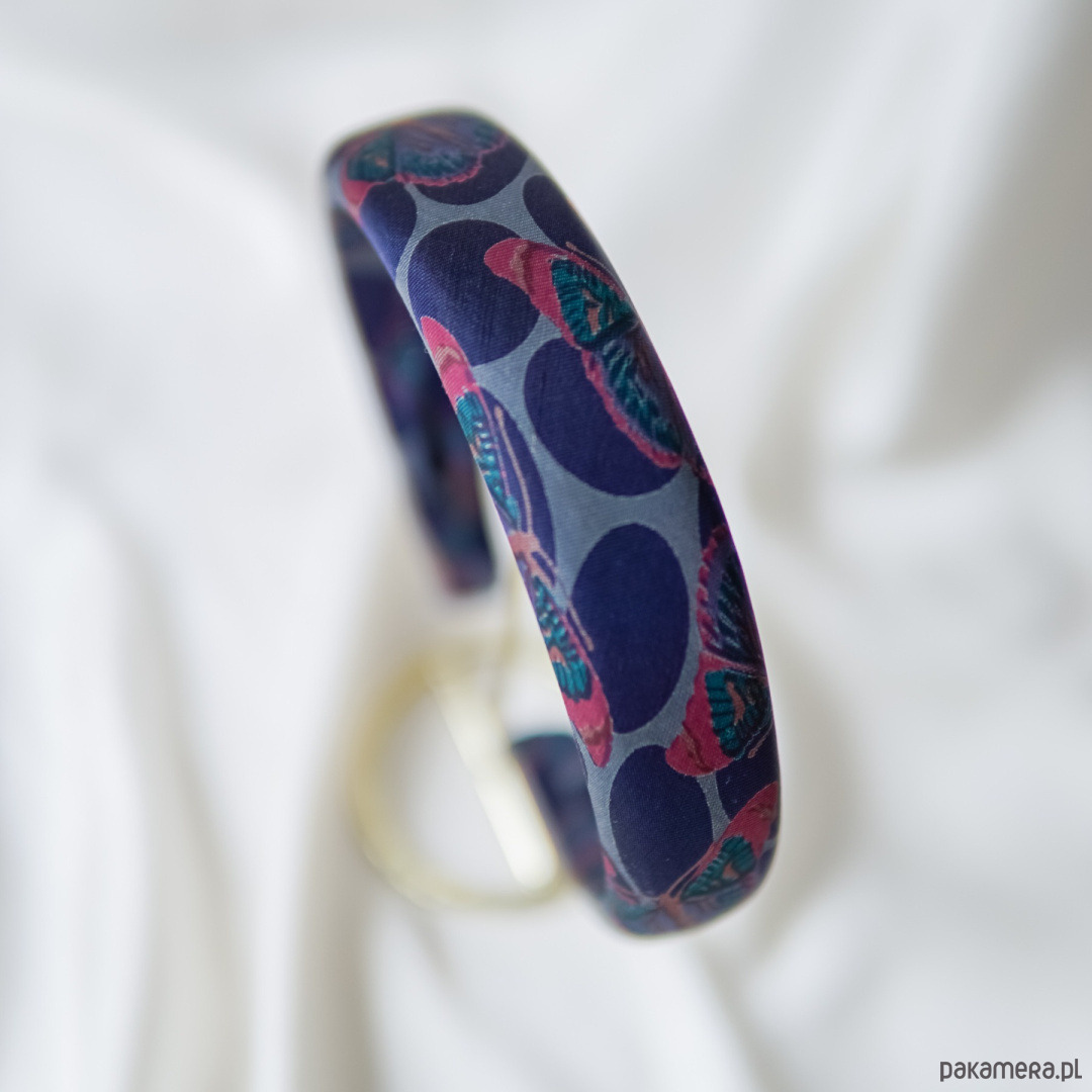 Opaska na włosy stworzona z jedwabnego, męskiego krawata. Tkanina jest wyjątkowo wzorzysta i delikatna. Model ozdoby na włosy w niecodziennym wydaniu. Lekka i wygodna opaska na głowę dla kobiet, które chcą podkreślić swoją fryzurę. Opaska jest w uniwersalnym rozmiarze, dopasowuje się do kształtu głowy. Została stworzona na gotowej wyprasce o szerokości 3 cm. Bardzo miękka gąbka powoduje, że opaska odstaje od głowy na wysokość ok. 0,5 cm. Daje to efekt tiary lub delikatnej korony. Pasuje kobietom o długich i krótkich włosach. Sprawdzi się w niedbałych koczkach, kucykach oraz warkoczach. Urozmaici fryzury wieczorowe i codzienne.