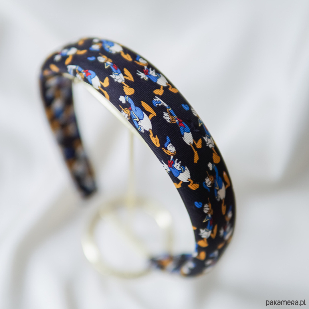 Opaska na włosy stworzona z jedwabnego, męskiego krawata. Tkanina jest wyjątkowo wzorzysta i delikatna. Model ozdoby na włosy w niecodziennym wydaniu. Lekka i wygodna opaska na głowę dla kobiet, które chcą podkreślić swoją fryzurę. Opaska jest w uniwersalnym rozmiarze, dopasowuje się do kształtu głowy. Została stworzona na gotowej wyprasce o szerokości 3 cm. Bardzo miękka gąbka powoduje, że opaska odstaje od głowy na wysokość ok. 0,5 cm. Daje to efekt tiary lub delikatnej korony. Pasuje kobietom o długich i krótkich włosach. Sprawdzi się w niedbałych koczkach, kucykach oraz warkoczach. Urozmaici fryzury wieczorowe i codzienne.