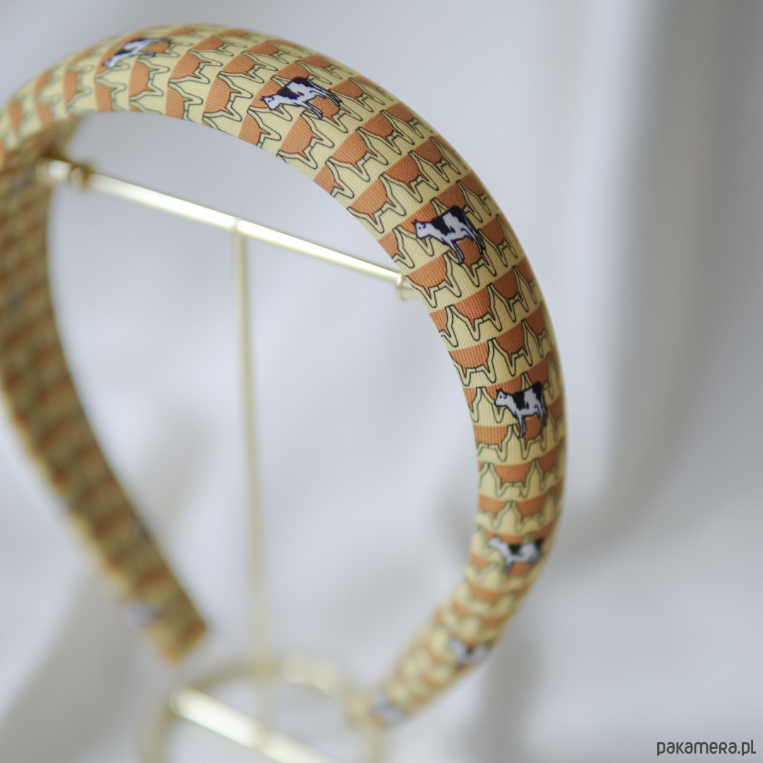 Opaska na włosy stworzona z jedwabnego, męskiego krawata. Tkanina jest wyjątkowo wzorzysta i delikatna. Model ozdoby na włosy w niecodziennym wydaniu. Lekka i wygodna opaska na głowę dla kobiet, które chcą podkreślić swoją fryzurę. Opaska jest w uniwersalnym rozmiarze, dopasowuje się do kształtu głowy. Została stworzona na gotowej wyprasce o szerokości 3 cm. Bardzo miękka gąbka powoduje, że opaska odstaje od głowy na wysokość ok. 0,5 cm. Daje to efekt tiary lub delikatnej korony. Pasuje kobietom o długich i krótkich włosach. Sprawdzi się w niedbałych koczkach, kucykach oraz warkoczach. Urozmaici fryzury wieczorowe i codzienne.