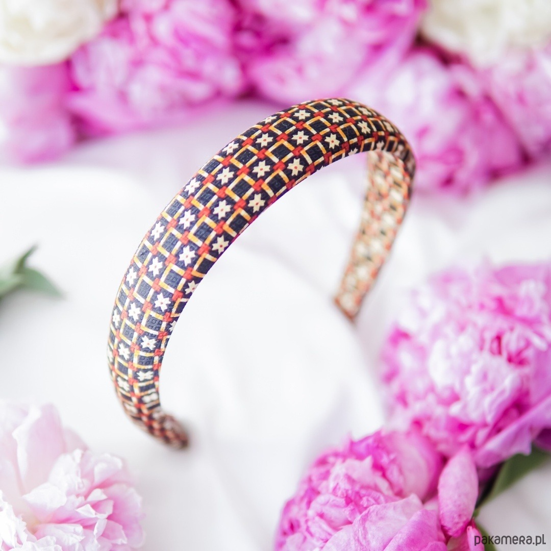 Mozaikowy deseń granatu, bursztynu i kości słoniowej subtelnie ożywi biały T-shirt, a w wieczorowym wydaniu doda charakteru małej czarnej. W dni „casual Friday” połącz opaskę z marynarką w prążki, jeansami i loafersami – mały akcent, a efekt wow murowany.