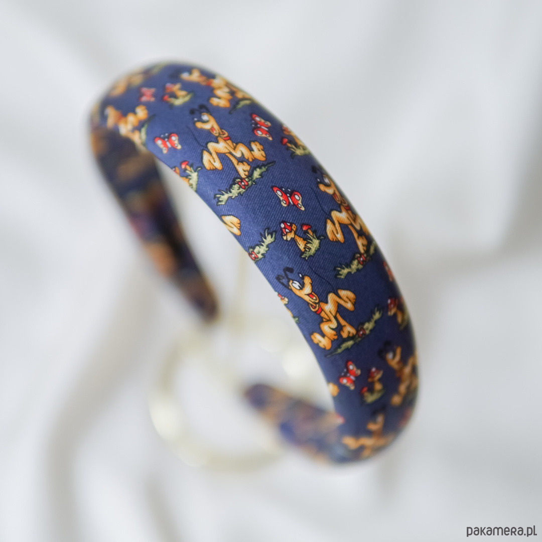 Opaska na włosy stworzona z jedwabnego, męskiego krawata. Tkanina jest wyjątkowo wzorzysta i delikatna. Model ozdoby na włosy w niecodziennym wydaniu. Lekka i wygodna opaska na głowę dla kobiet, które chcą podkreślić swoją fryzurę. Opaska jest w uniwersalnym rozmiarze, dopasowuje się do kształtu głowy. Została stworzona na gotowej wyprasce o szerokości 3 cm. Bardzo miękka gąbka powoduje, że opaska odstaje od głowy na wysokość ok. 0,5 cm. Daje to efekt tiary lub delikatnej korony. Pasuje kobietom o długich i krótkich włosach. Sprawdzi się w niedbałych koczkach, kucykach oraz warkoczach. Urozmaici fryzury wieczorowe i codzienne.