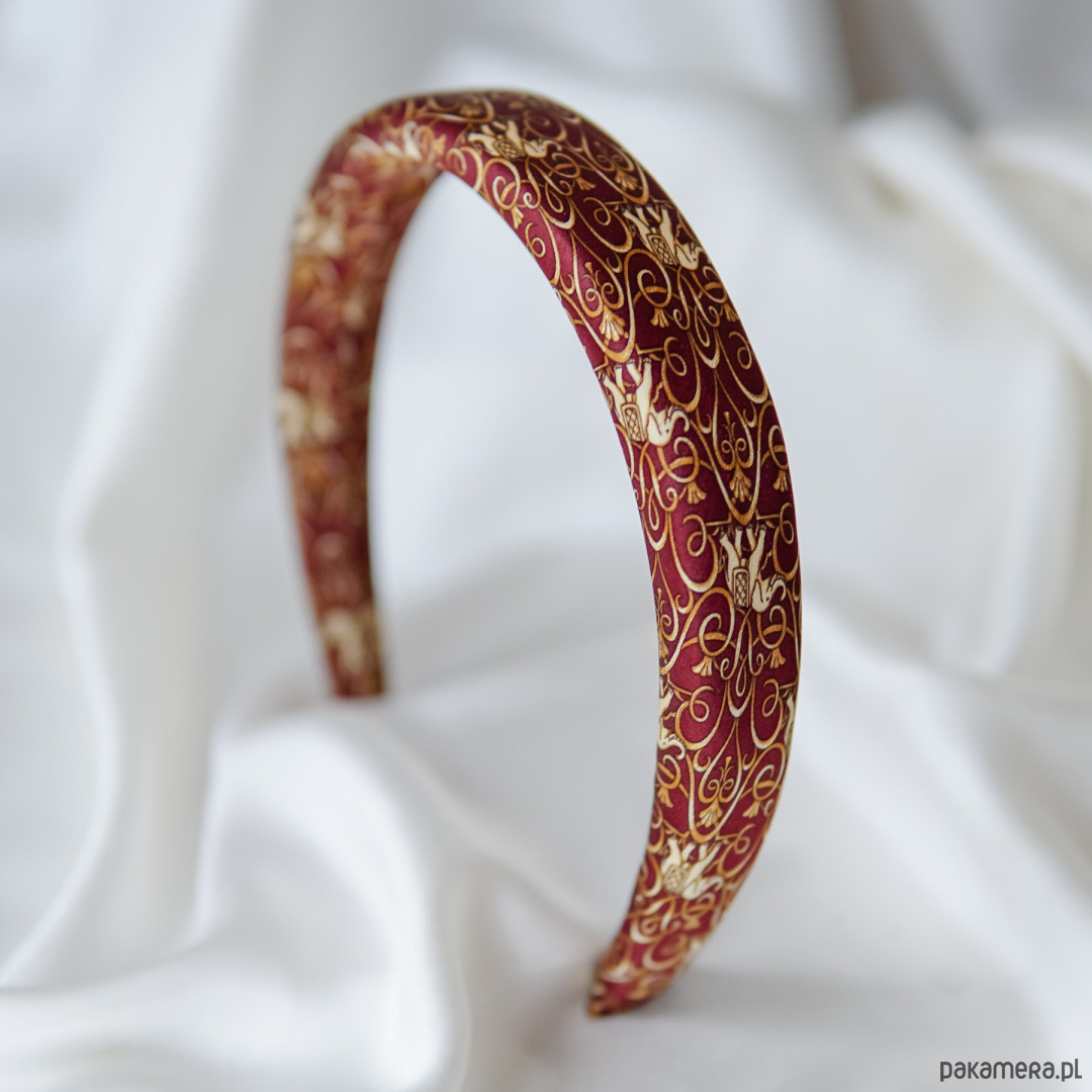 Opaska na włosy stworzona z jedwabnego, męskiego krawata. Tkanina jest wyjątkowo wzorzysta i delikatna. Model ozdoby na włosy w niecodziennym wydaniu. Lekka i wygodna opaska na głowę dla kobiet, które chcą podkreślić swoją fryzurę. Opaska jest w uniwersalnym rozmiarze, dopasowuje się do kształtu głowy. Została stworzona na gotowej wyprasce o szerokości 3 cm. Bardzo miękka gąbka powoduje, że opaska odstaje od głowy na wysokość ok. 0,5 cm. Daje to efekt tiary lub delikatnej korony. Pasuje kobietom o długich i krótkich włosach. Sprawdzi się w niedbałych koczkach, kucykach oraz warkoczach. Urozmaici fryzury wieczorowe i codzienne.