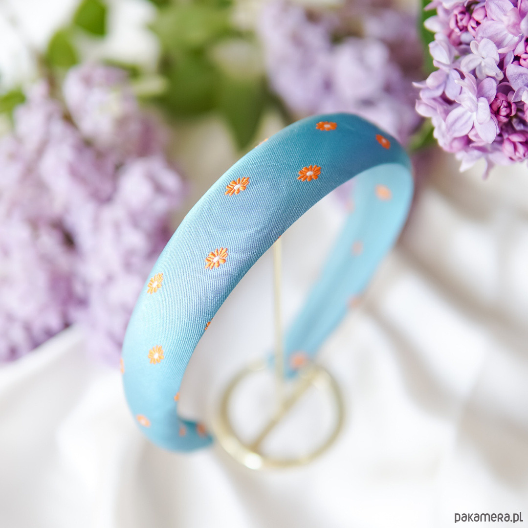Opaska na włosy stworzona z jedwabnego, męskiego krawata. Tkanina jest wyjątkowo wzorzysta i delikatna. Model ozdoby na włosy w niecodziennym wydaniu. Lekka i wygodna opaska na głowę dla kobiet, które chcą podkreślić swoją fryzurę. Opaska jest w uniwersalnym rozmiarze, dopasowuje się do kształtu głowy. Została stworzona na gotowej wyprasce o szerokości 3 cm. Bardzo miękka gąbka powoduje, że opaska odstaje od głowy na wysokość ok. 0,5 cm. Daje to efekt tiary lub delikatnej korony. Pasuje kobietom o długich i krótkich włosach. Sprawdzi się w niedbałych koczkach, kucykach oraz warkoczach. Urozmaici fryzury wieczorowe i codzienne.