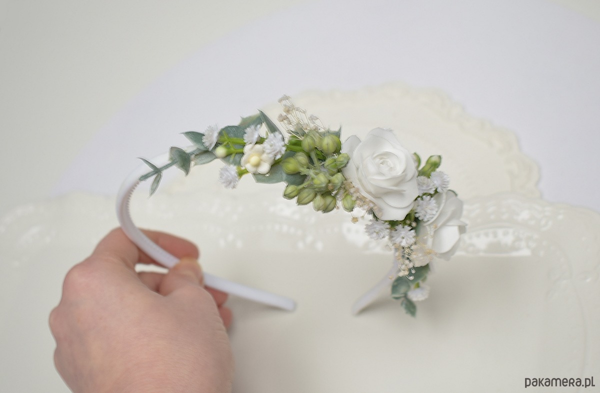 Piękna, delikatna opaska kwiatowa komunijna, w kolorystyce biel, zielone listki eukaliptusa.
