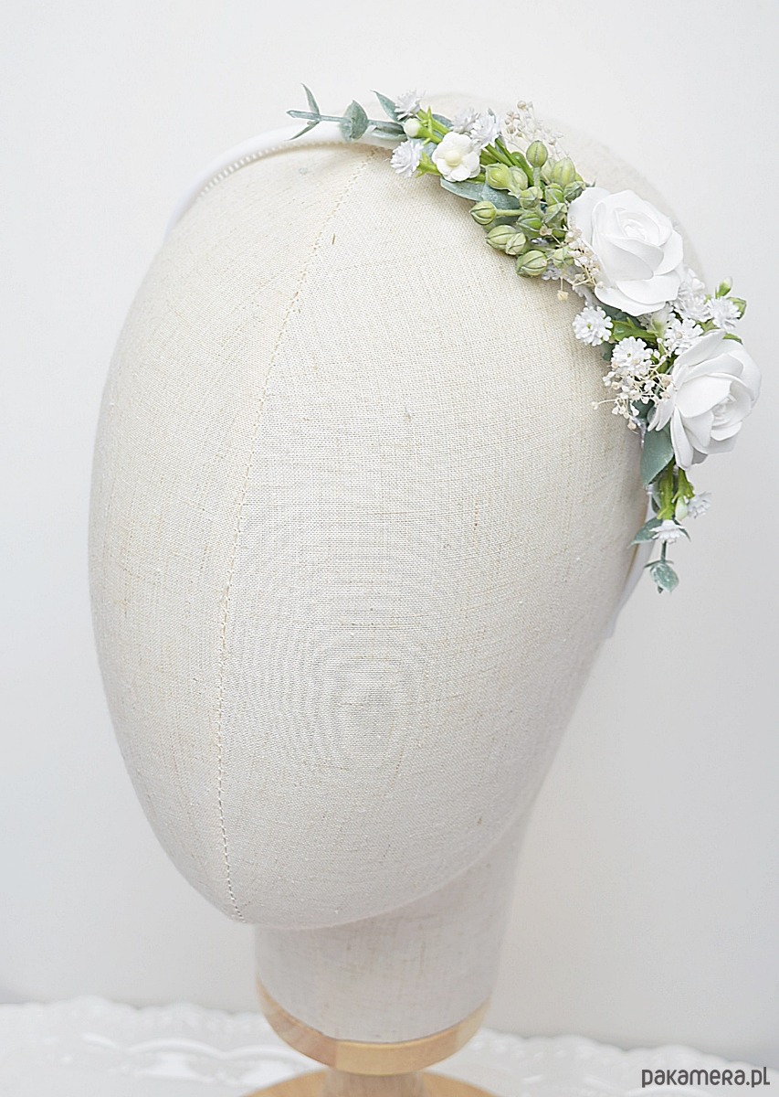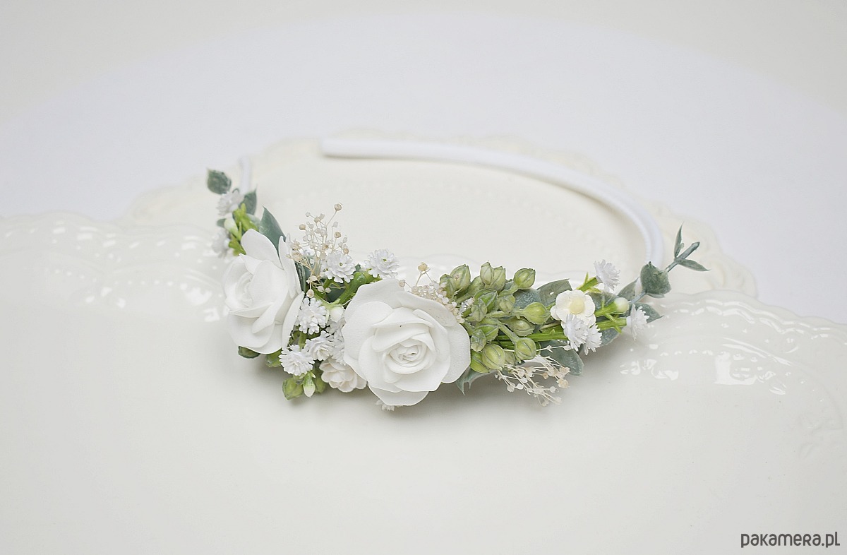 Piękna, delikatna opaska kwiatowa komunijna, w kolorystyce biel, zielone listki eukaliptusa.