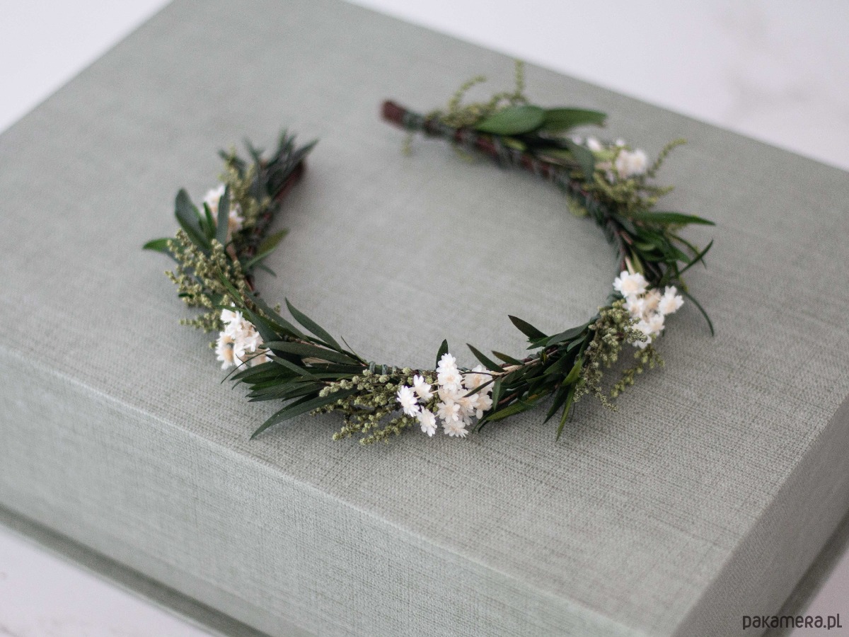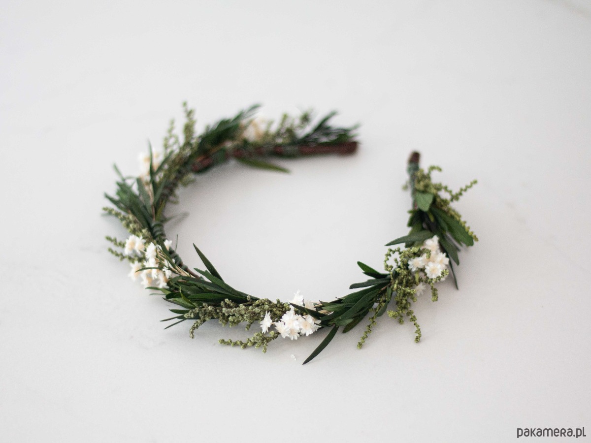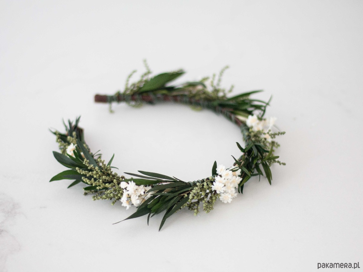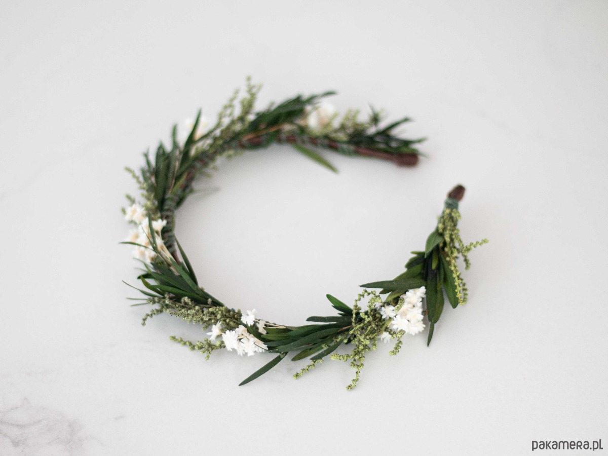 Romantyczna opaska na głowę wykonany z naturalnych, stabilizowanych listków. Uroczym dodatkiem są małe, suszone kwiaty. Rośliny stabilizowane w roztworze gliceryny przetrwają przynajmniej kilka miesięcy. Opaska pasuje zarówno na głowę dziecka, jak i osoby dorosłej.