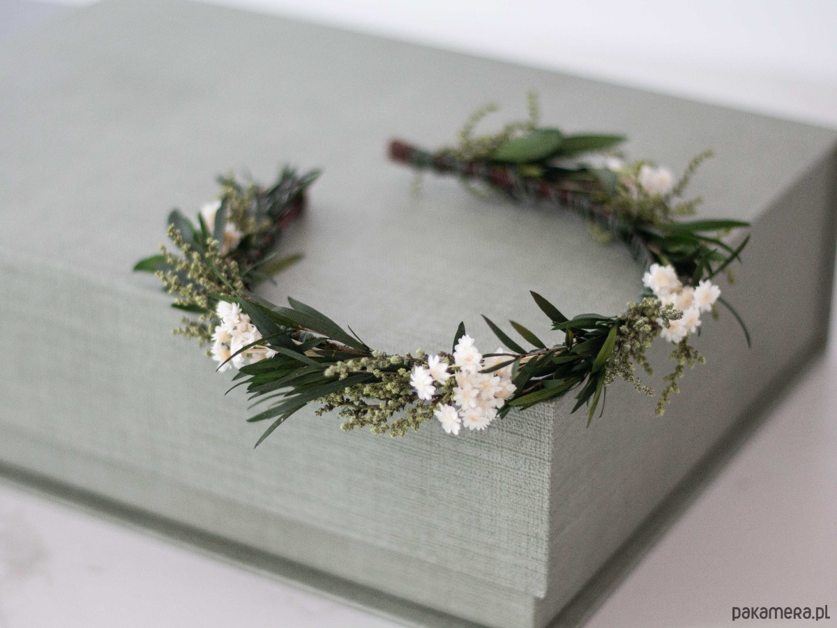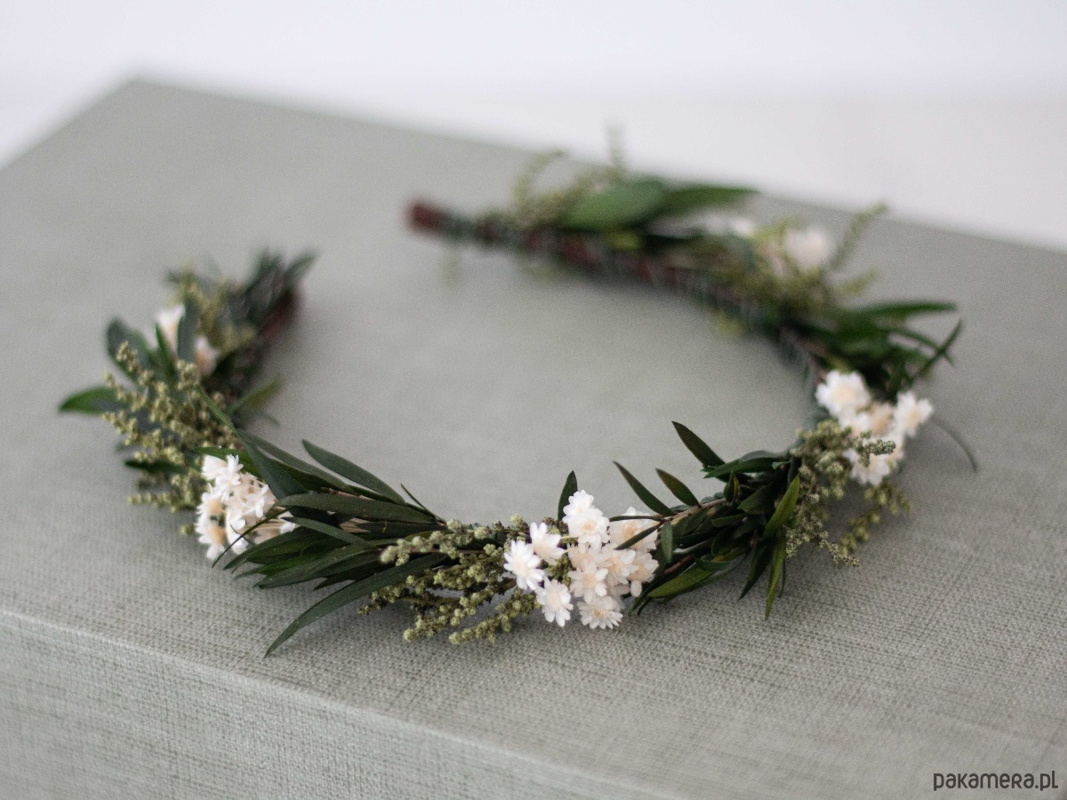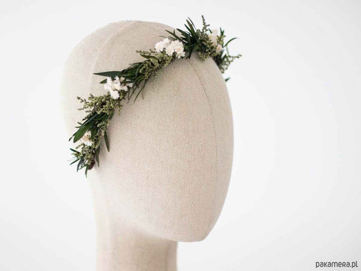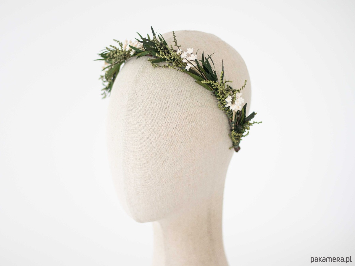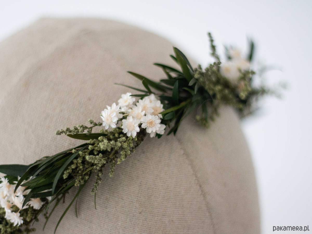 Romantyczna opaska na głowę wykonany z naturalnych, stabilizowanych listków. Uroczym dodatkiem są małe, suszone kwiaty. Rośliny stabilizowane w roztworze gliceryny przetrwają przynajmniej kilka miesięcy. Opaska pasuje zarówno na głowę dziecka, jak i osoby dorosłej.
