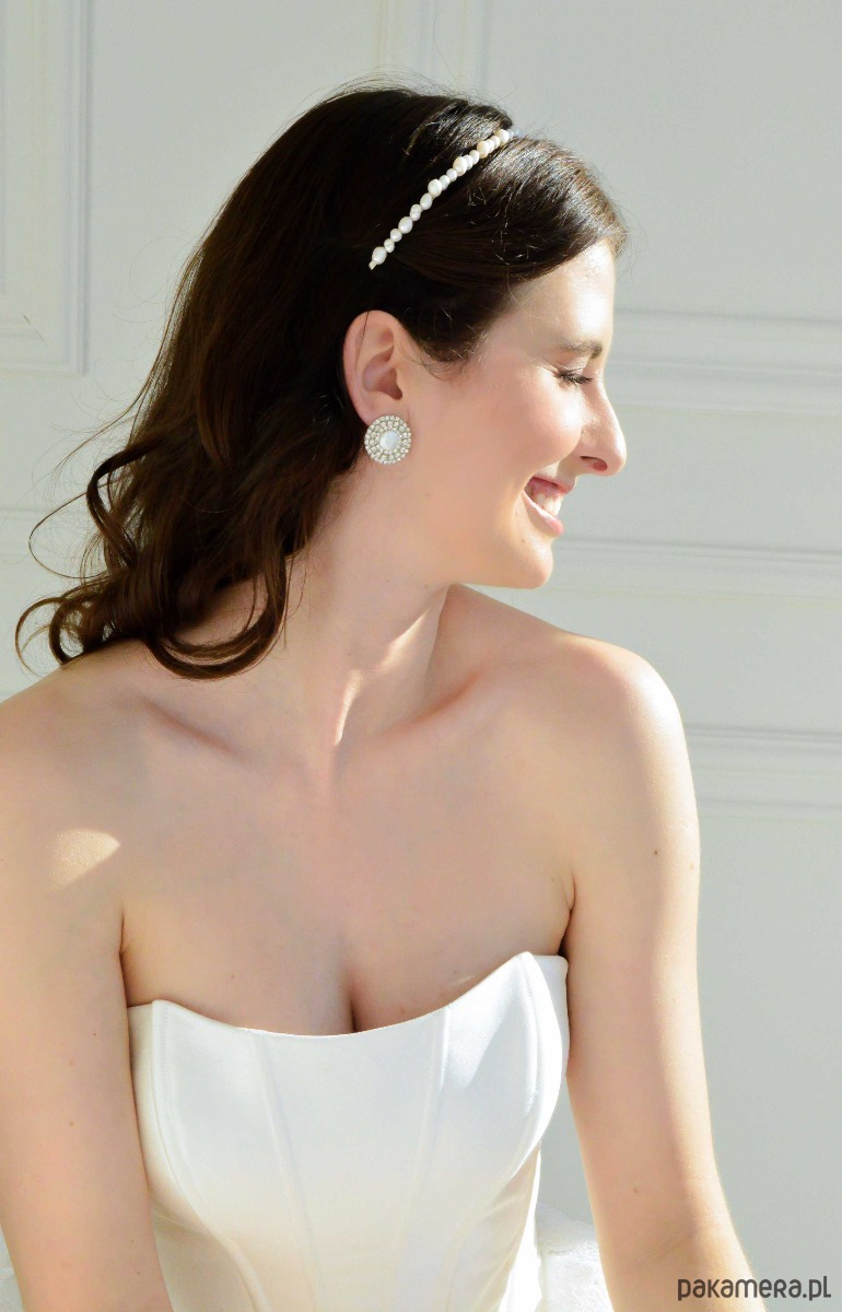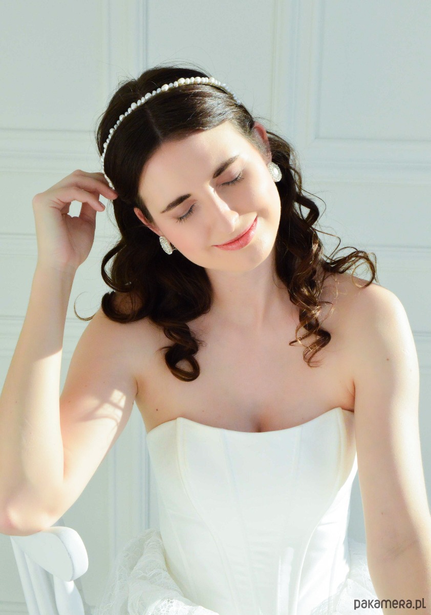 Metalowa baza opaski w kolorze srebrnym przystrojona naturalnymi perłami słodkowodnymi. Wygodna, lekka, idealna do sukien w stylu romantycznego. Piękna klasyka do przystrojenia włosów spiętych jak i rozpuszczonych. Dostępna także wersja złota.