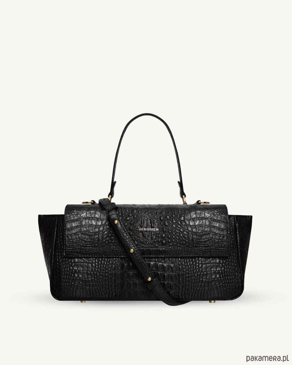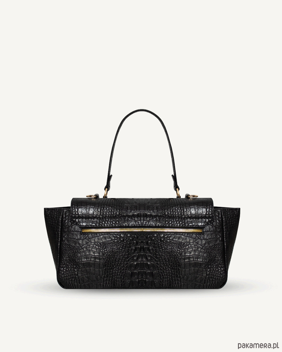 Torebka wykonana z naturalnej skóry tłoczonej na wzór krokodyla, wykończona materiałową wodoodporną podszewką. Zapinana na dwa magnesy i suwak. W środku znajdują się dwie kieszenie, duża kieszeń wielkości torebki, zapinana na suwak pod klapą i otwarta wewnątrz torby przedzielona na pół. Na zewnętrznej stronie torby duża kieszeń zapinana na suwak. Na dnie pięć metalowych nóżek, które chronią torbę przed zniszczeniem. Posiada skórzany pasek z dużą możliwością regulacji długości.