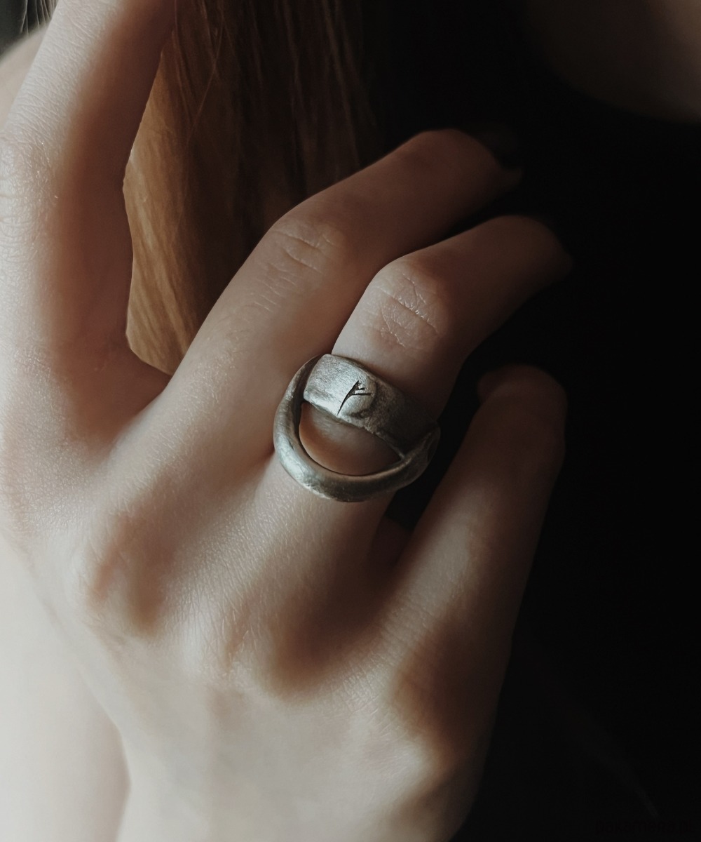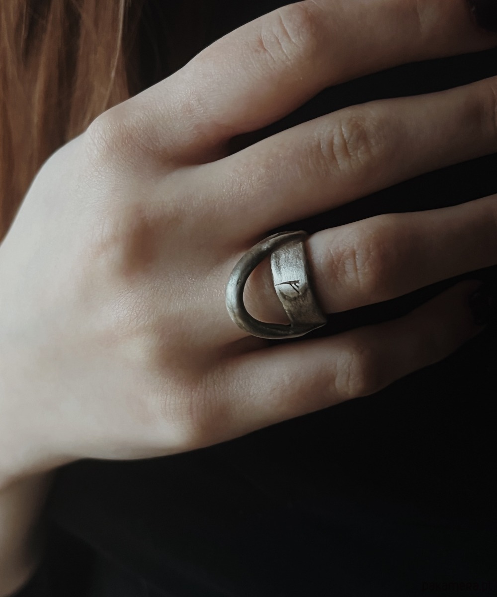The ring handcrafted from silver, the heart of which is the engraved Fehu rune, attracts attention with its simplicity and unusual meaning.