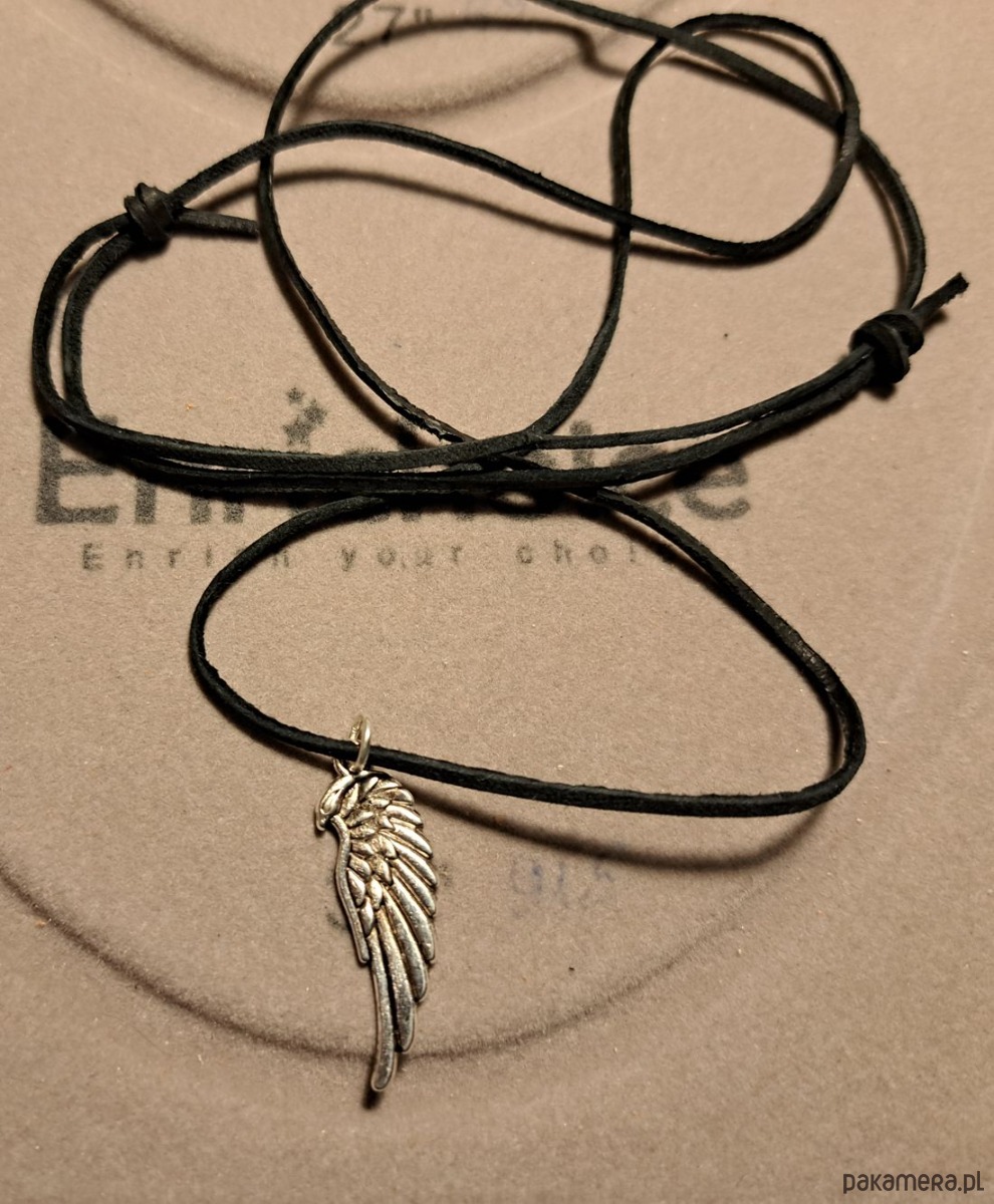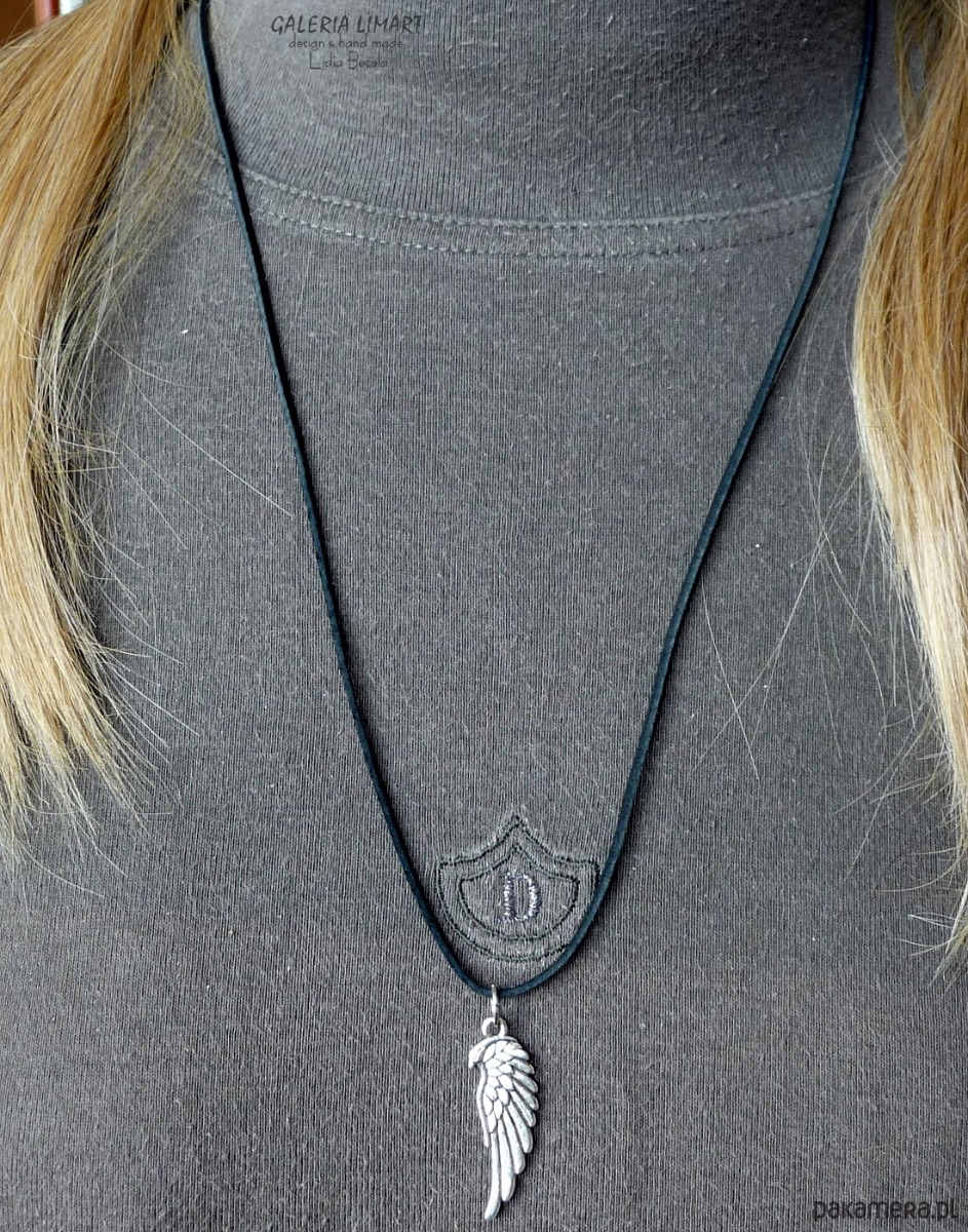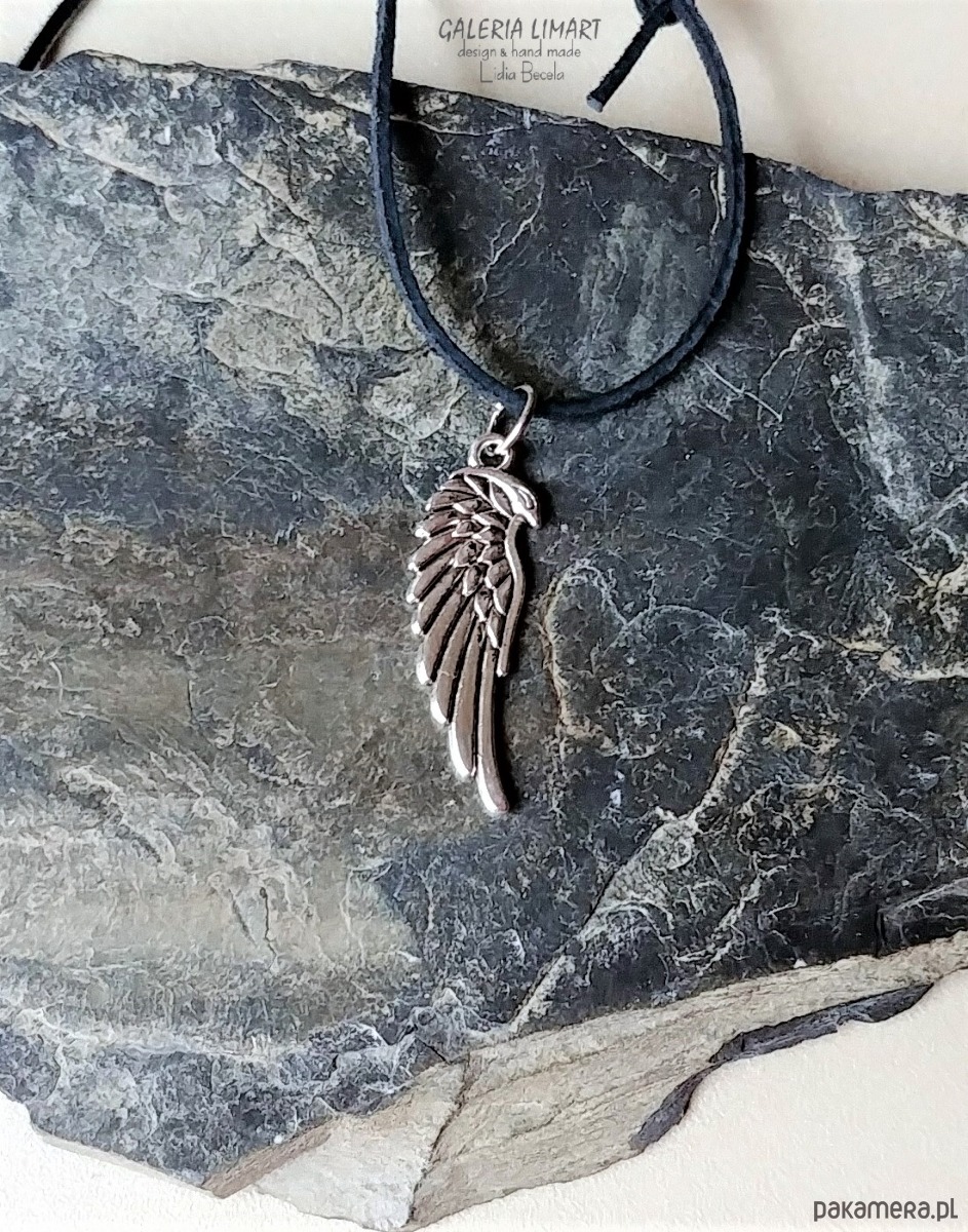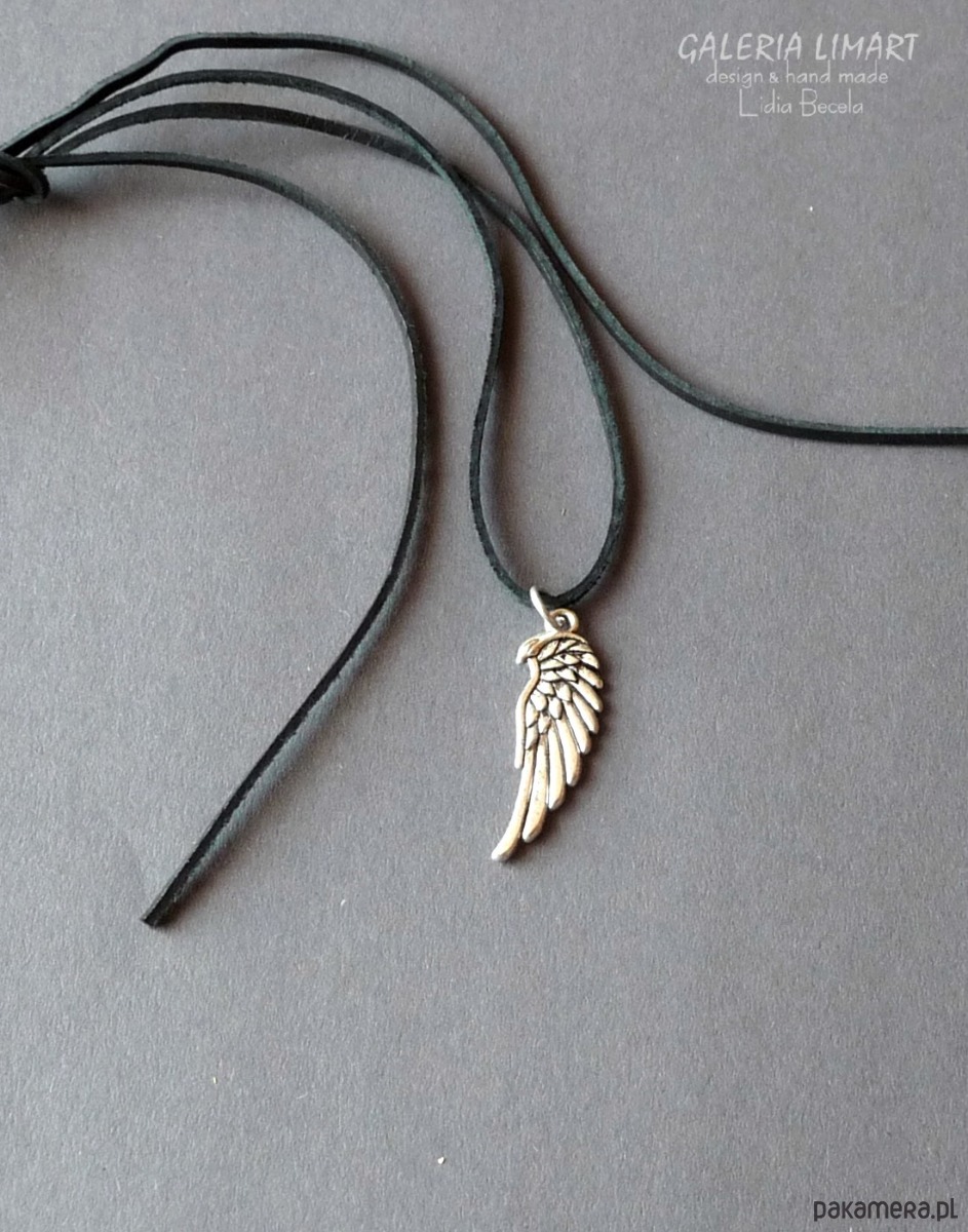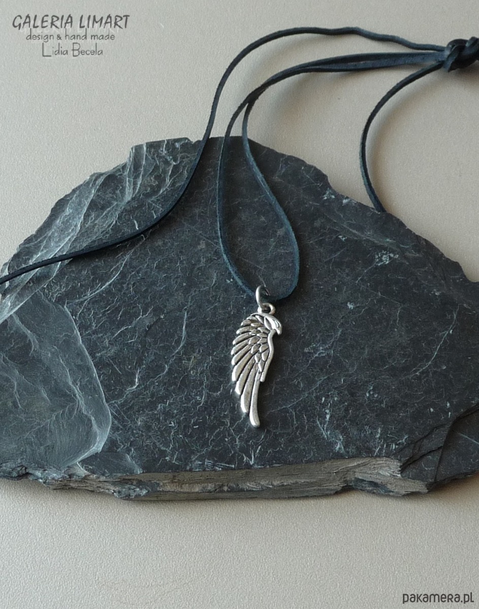 Uroczy minimalistyczny wisiorek talizman z pięknym w swej formie (ok. 4 cm) podwieszonym na rzemieniu symbolicznym skrzydłem anioła.