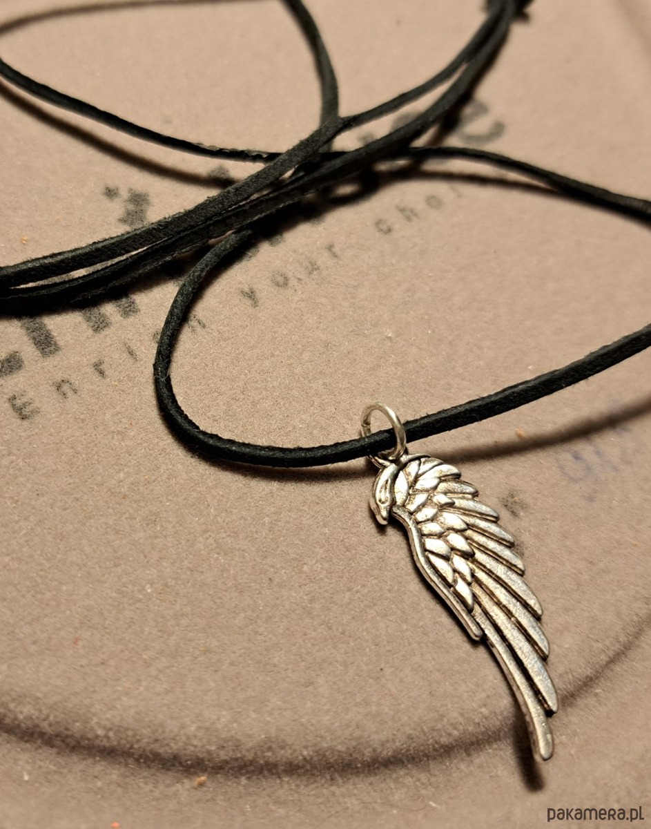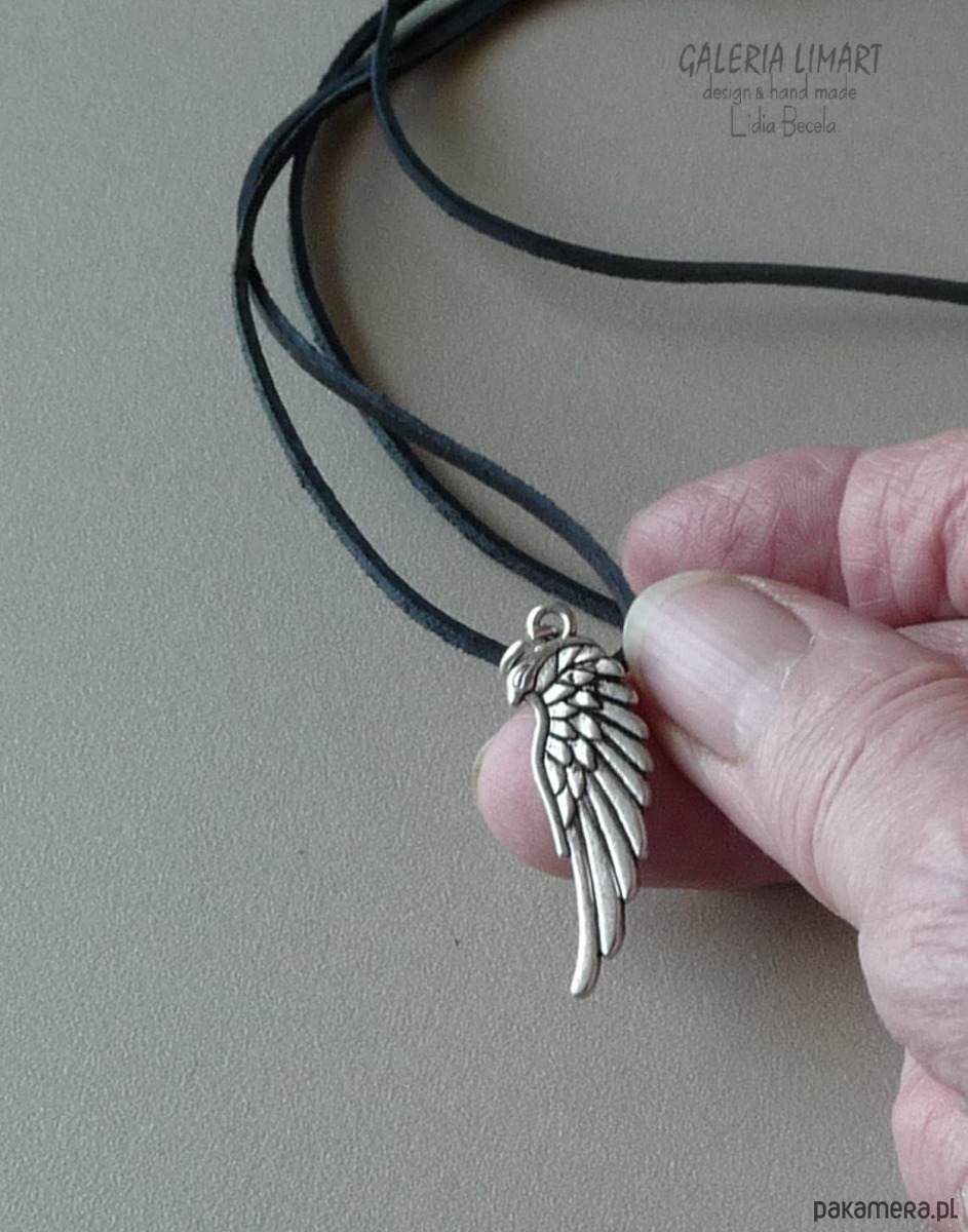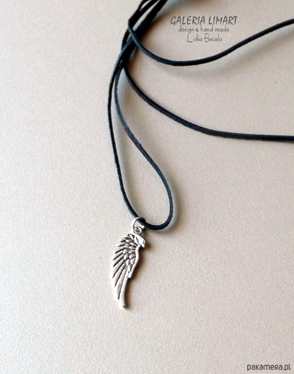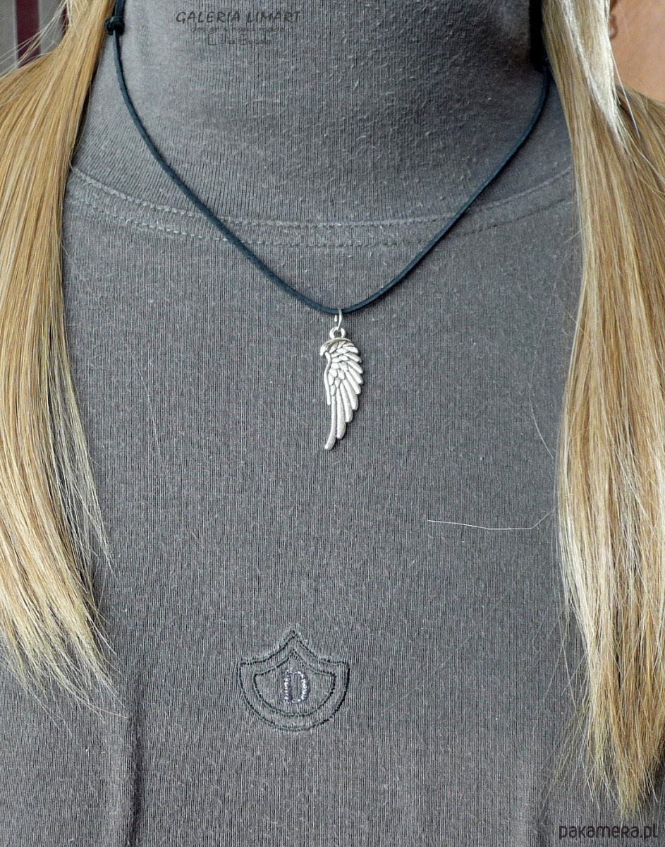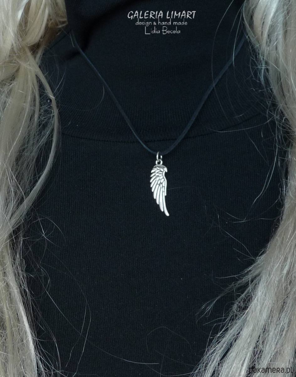 Uroczy minimalistyczny wisiorek talizman z pięknym w swej formie (ok. 4 cm) podwieszonym na rzemieniu symbolicznym skrzydłem anioła.