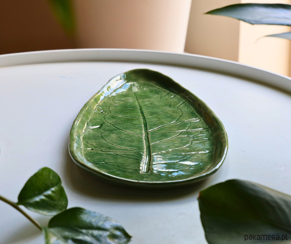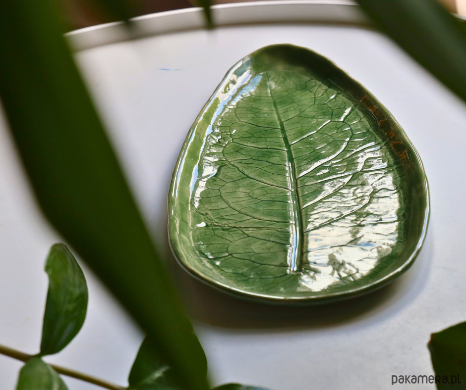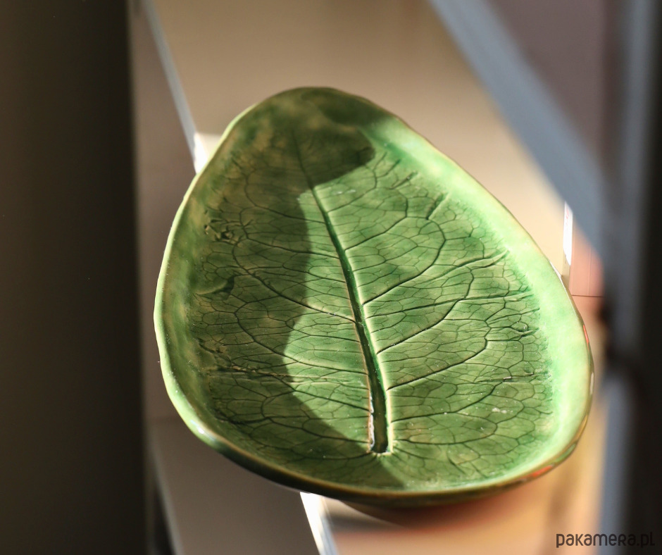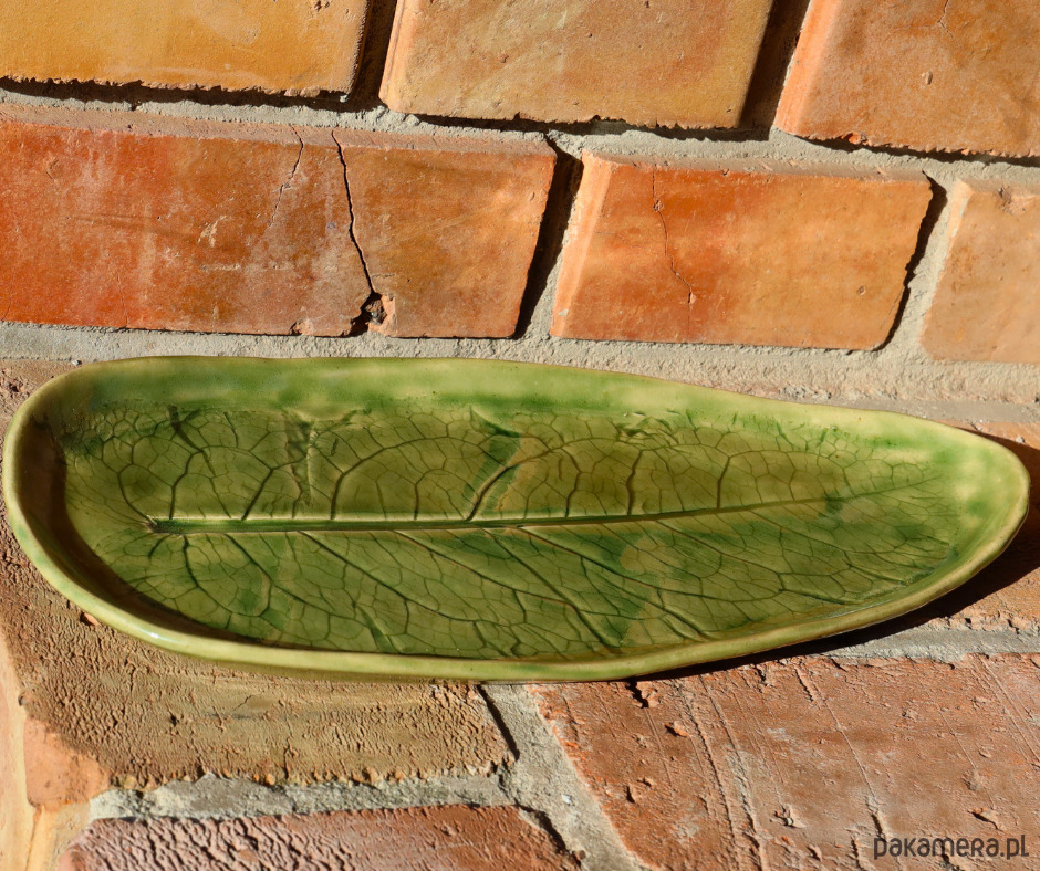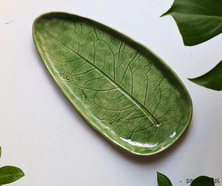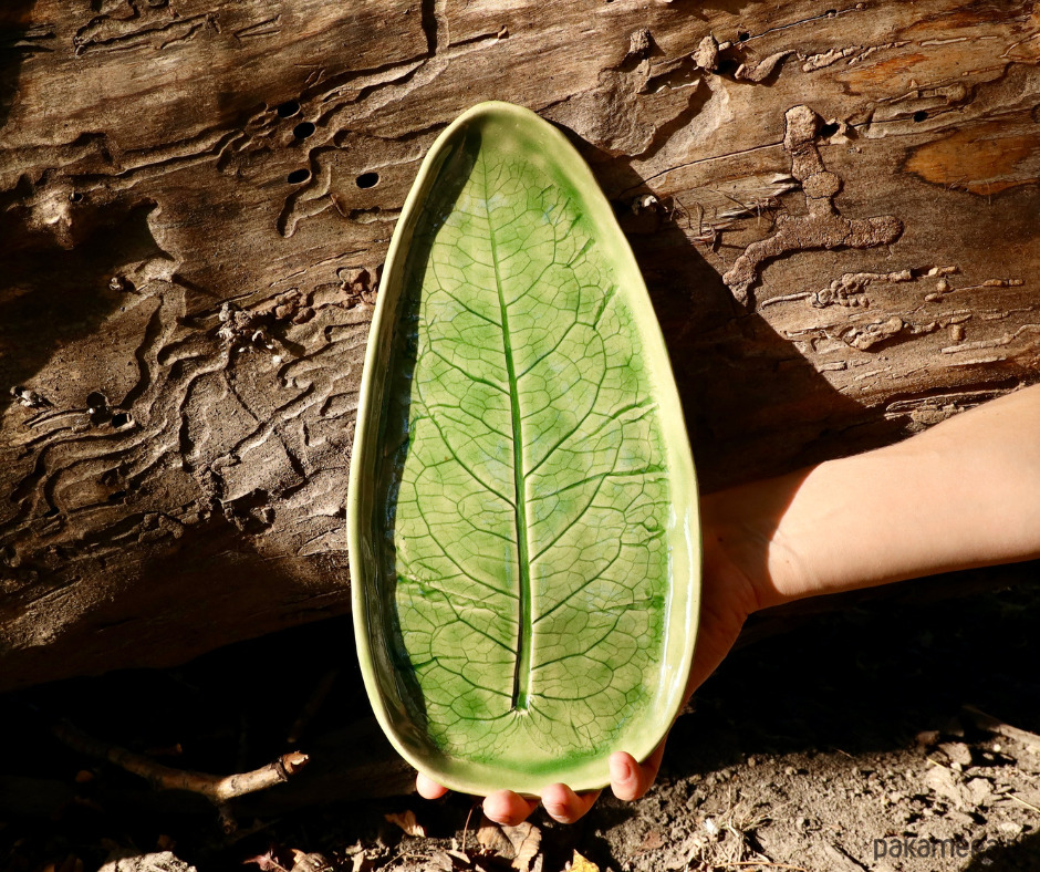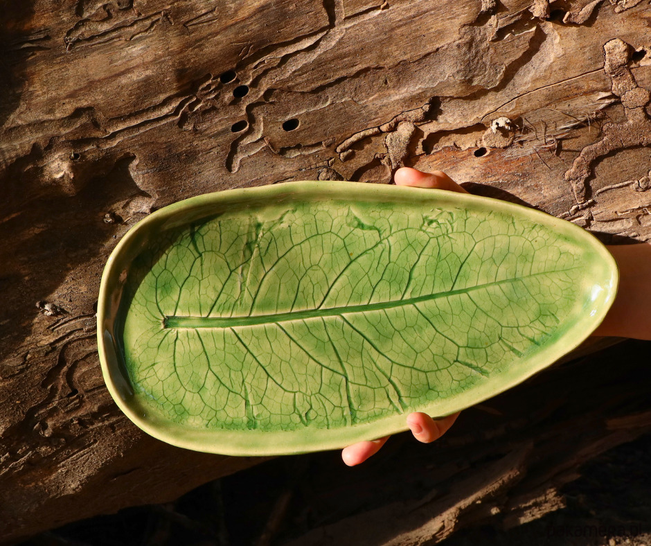 Podłużna zielona patera z liściem szczawiu z kolekcji Opowieść lasu. Szczaw, który jest głównym elementem tej patery ma liczne zastosowania w kuchni i lecznictwie. To idealny dodatek dla miłośników natury i posiadaczy domowej dżungli. Patera może być wykorzystywana zawórko do serwowania potraw jak i jako podstawka na różne rzeczy np. palo santo, biżuterię czy świeczki. Lepiona i szkliwiona ręcznie z dbałością o szczegóły. Dwukrotnie wypalana w piecu ceramicznym.