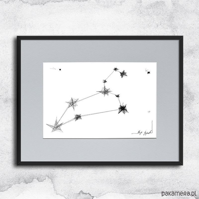 Grafika wykonana techniką mieszaną (giclée+rysunek isografem) na białym, matowym o lekko fakturowanej powierzchni, graficznym papierze Canson 250g. Unikalna kreska wygląda bardzo efektownie, zaś czarno-białe wykończenia wnętrz idealnie wpisują się puste w ściany nowoczesnych, minimalistycznych czy loftowych powierzchni.