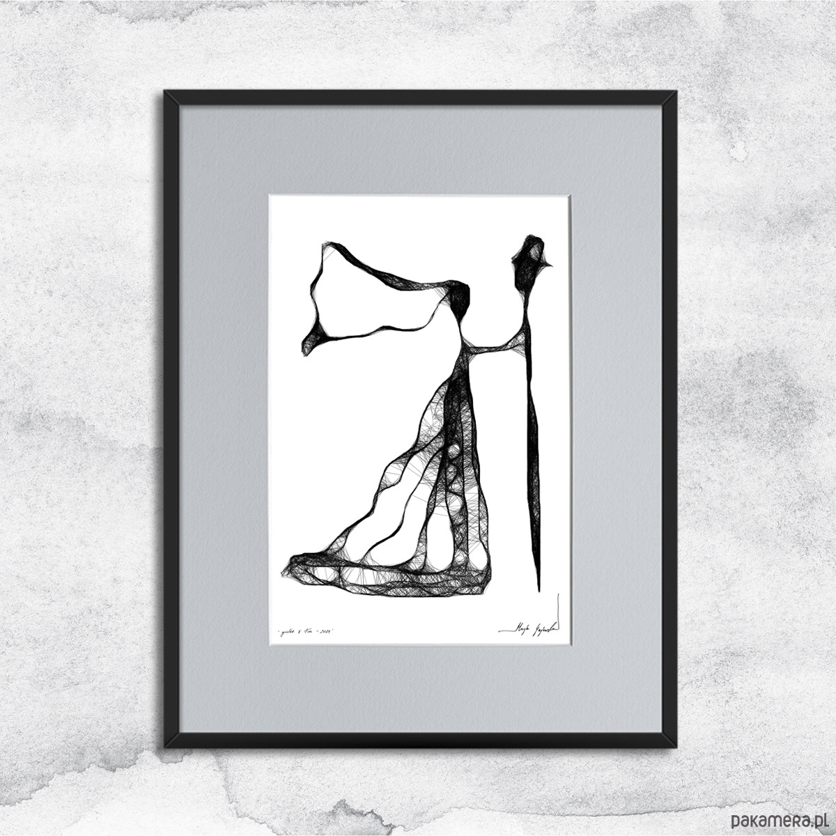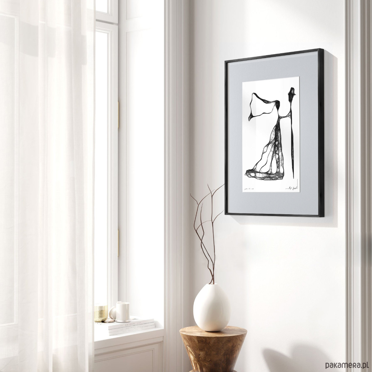 Autorska grafika wykonana techniką mieszaną (giclée, rysunek isografem) na białym, matowym o lekko fakturowanej powierzchni, graficznym papierze Canson 250g. Unikalna kreska wygląda bardzo efektownie, zaś czarno-białe wykończenia wnętrz idealnie wpisują się puste w ściany nowoczesnych, minimalistycznych czy loftowych powierzchni.