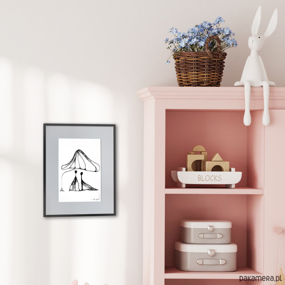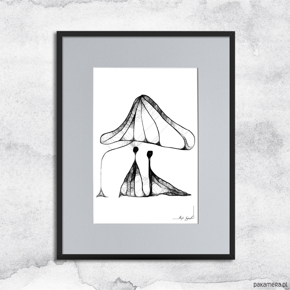 Autorska grafika wykonana techniką mieszaną (giclée, rysunek isografem) na białym, matowym o lekko fakturowanej powierzchni, graficznym papierze Canson 250g. Unikalna kreska wygląda bardzo efektownie, zaś czarno-białe wykończenia wnętrz idealnie wpisują się puste w ściany nowoczesnych, minimalistycznych czy loftowych powierzchni.