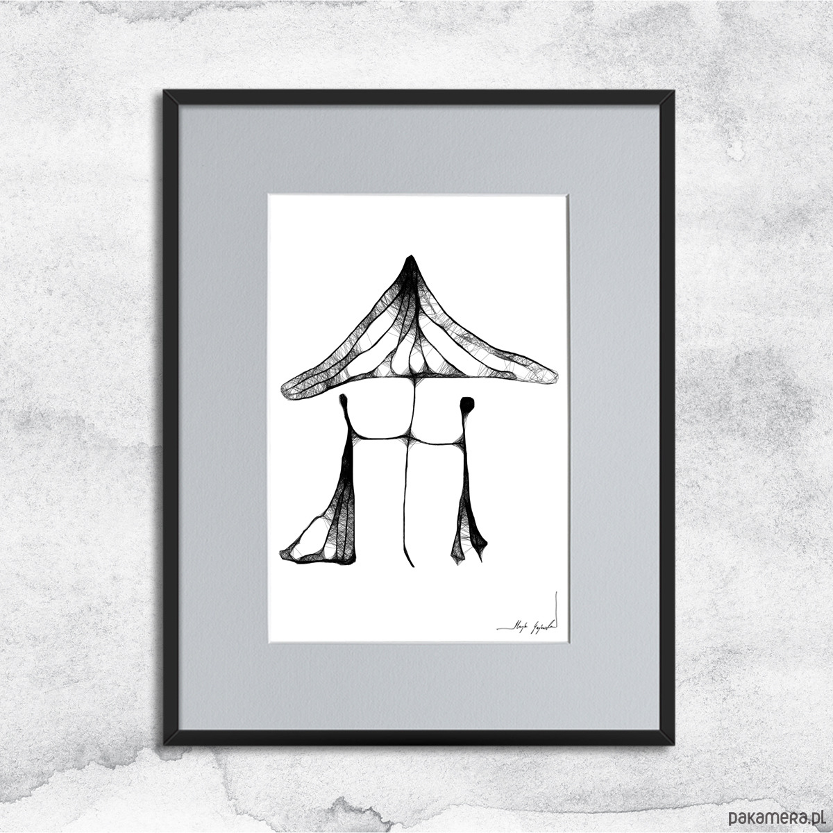 Autorska grafika wykonana techniką mieszaną (giclée, rysunek isografem) na białym, matowym o lekko fakturowanej powierzchni, graficznym papierze Canson 250g. Unikalna kreska wygląda bardzo efektownie, zaś czarno-białe wykończenia wnętrz idealnie wpisują się puste w ściany nowoczesnych, minimalistycznych czy loftowych powierzchni.