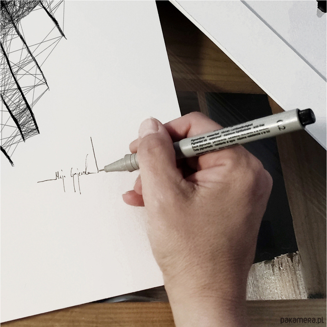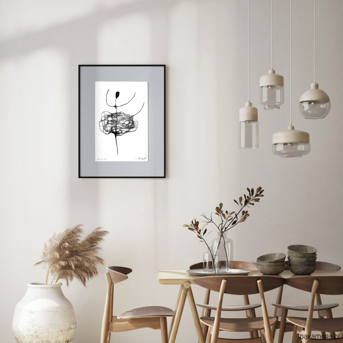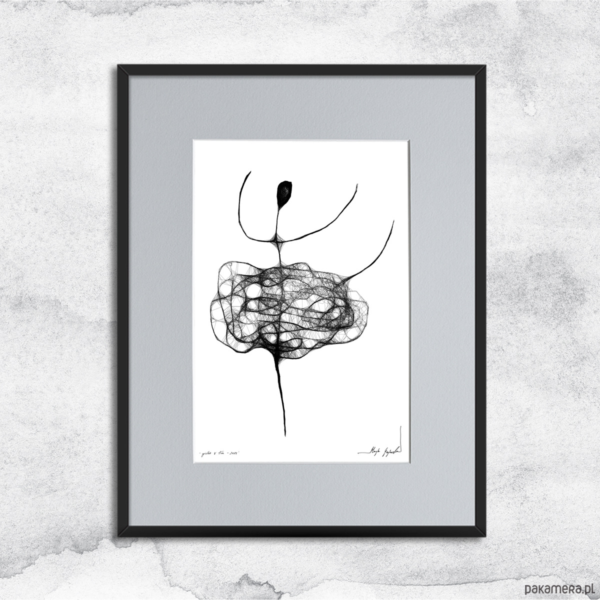 Autorska grafika wykonana techniką mieszaną (giclée, rysunek isografem) na białym, matowym o lekko fakturowanej powierzchni, graficznym papierze Canson 250g. Unikalna kreska wygląda bardzo efektownie, zaś czarno-białe wykończenia wnętrz idealnie wpisują się puste w ściany nowoczesnych, minimalistycznych czy loftowych powierzchni. Grafika z tej serii pozwoli Ci wprowadzić do wybranego pomieszczenia nieco subtelnej dynamiki w eleganckim wydaniu będąc intrygującą dekoracją na ścianę do salonu, czy sypialni.