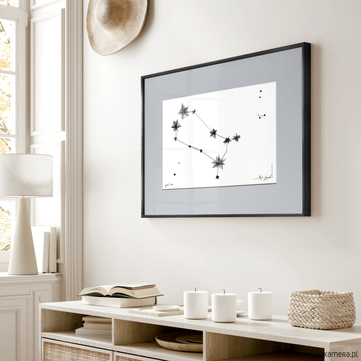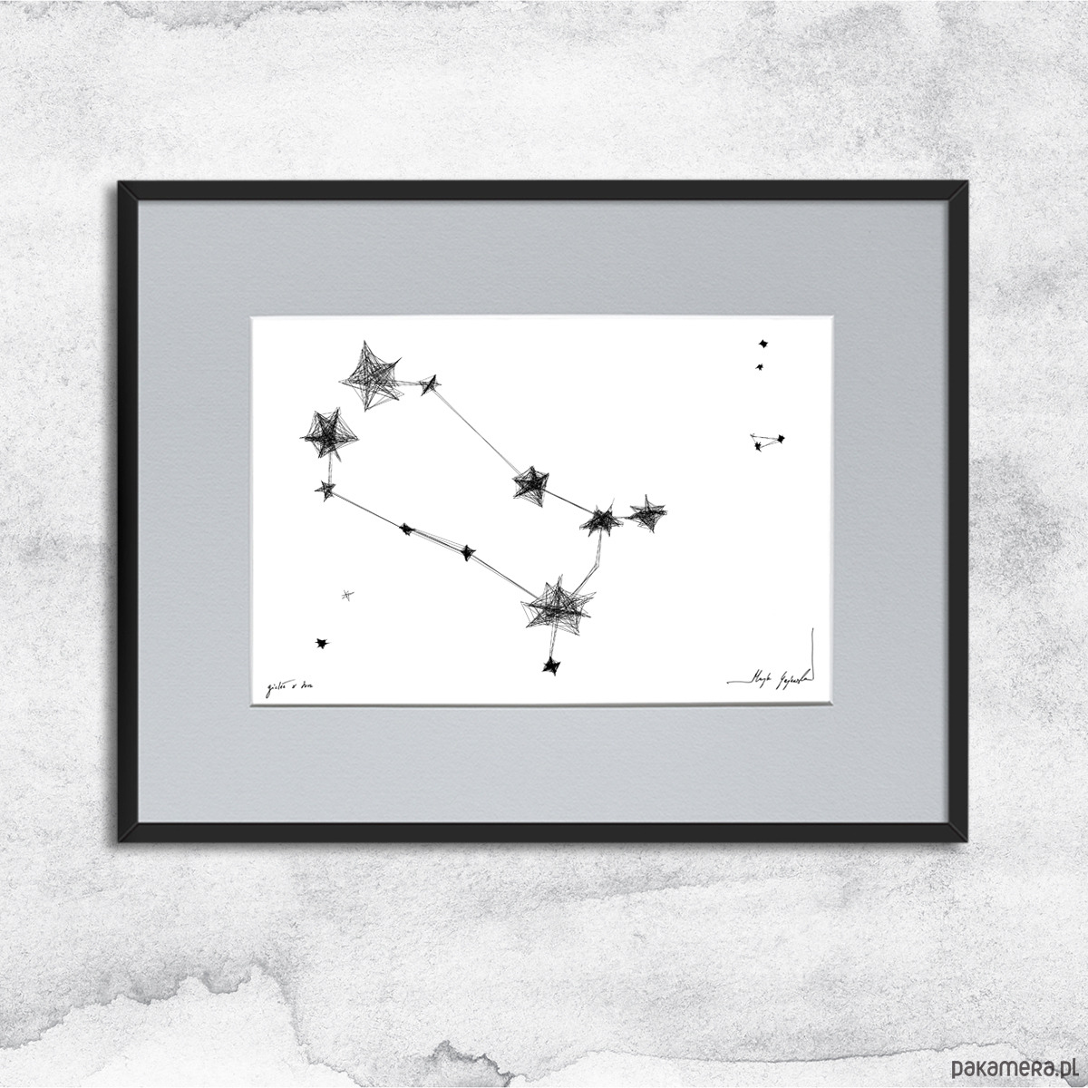Grafika wykonana techniką mieszaną (giclée i rysunek isografem) na białym, matowym o lekko fakturowanej powierzchni, graficznym papierze Canson 250g. Pełne harmonii i symboliki czarno-białe grafiki ze znakami zodiaku będą oryginalnym prezentem na urodziny. Charakterystycznie kreślone konstelacje odnajdą się we współczesnych wnętrzach z dodatkami bieli, szarości czy grafitu.