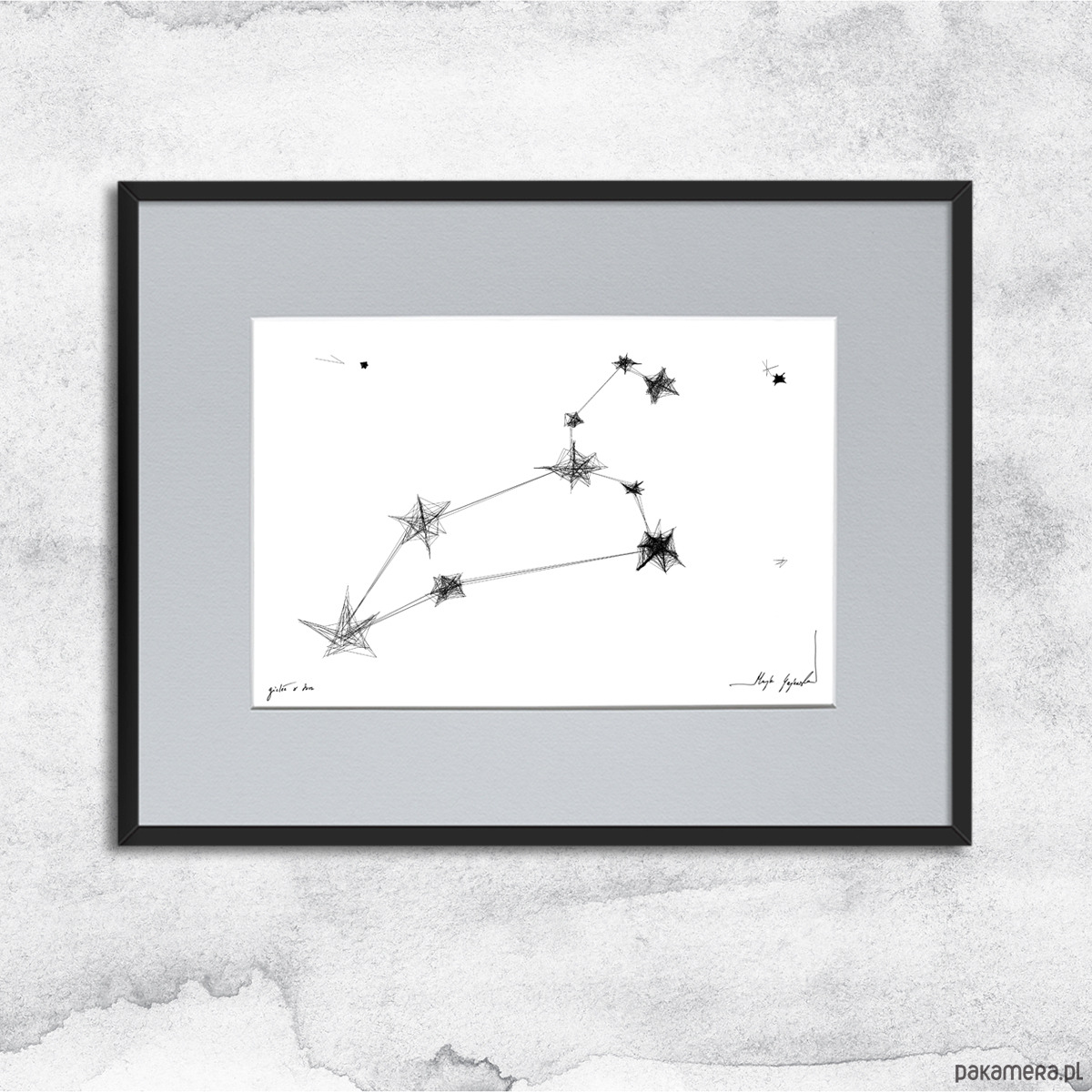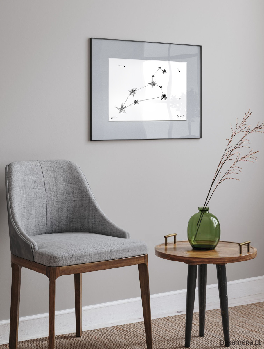 Grafika wykonana techniką mieszaną (giclée i rysunek isografem) na białym, matowym o lekko fakturowanej powierzchni, graficznym papierze Canson 250g. Pełne harmonii i symboliki czarno-białe grafiki ze znakami zodiaku będą oryginalnym prezentem na urodziny. Charakterystycznie kreślone konstelacje odnajdą się we współczesnych wnętrzach z dodatkami bieli, szarości czy grafitu.