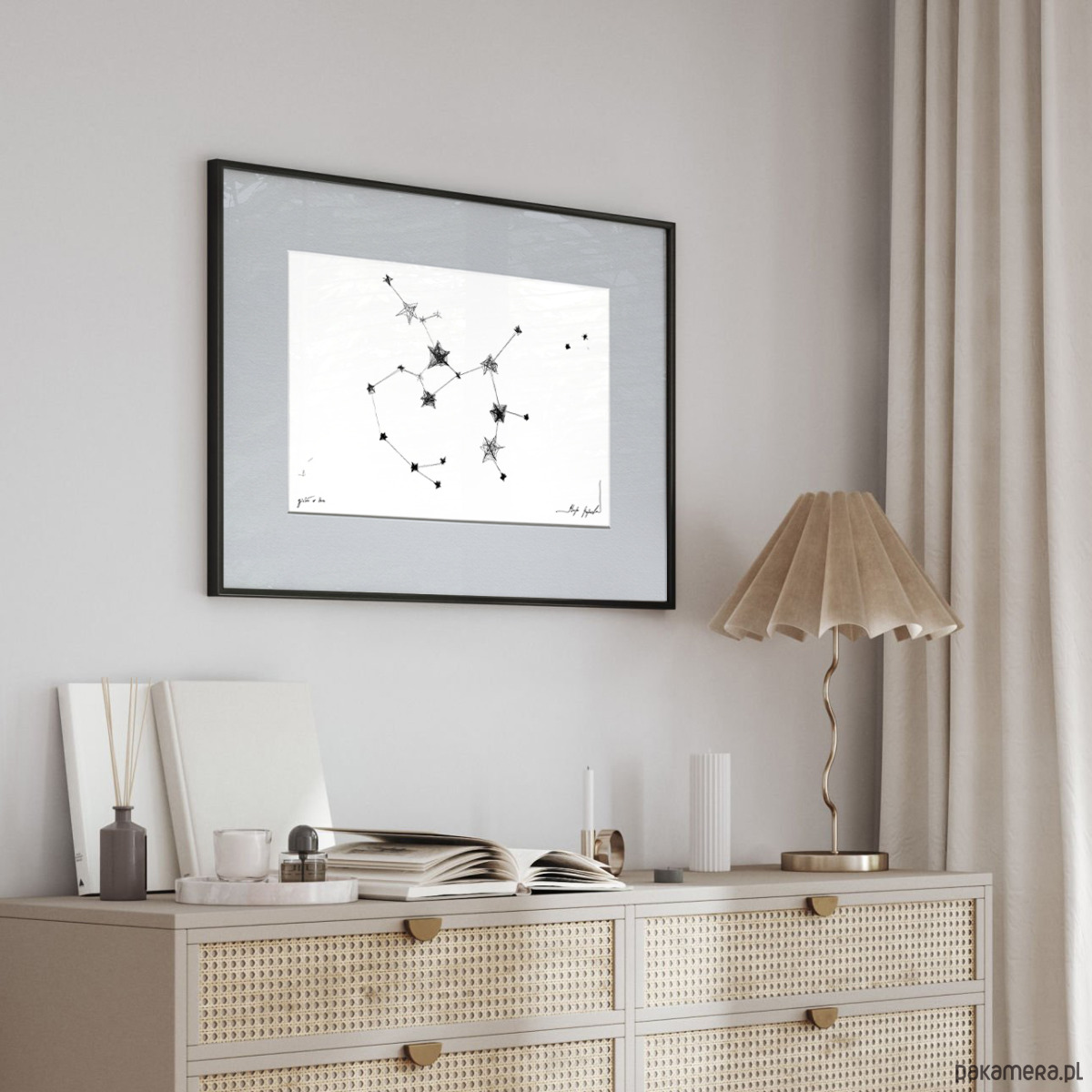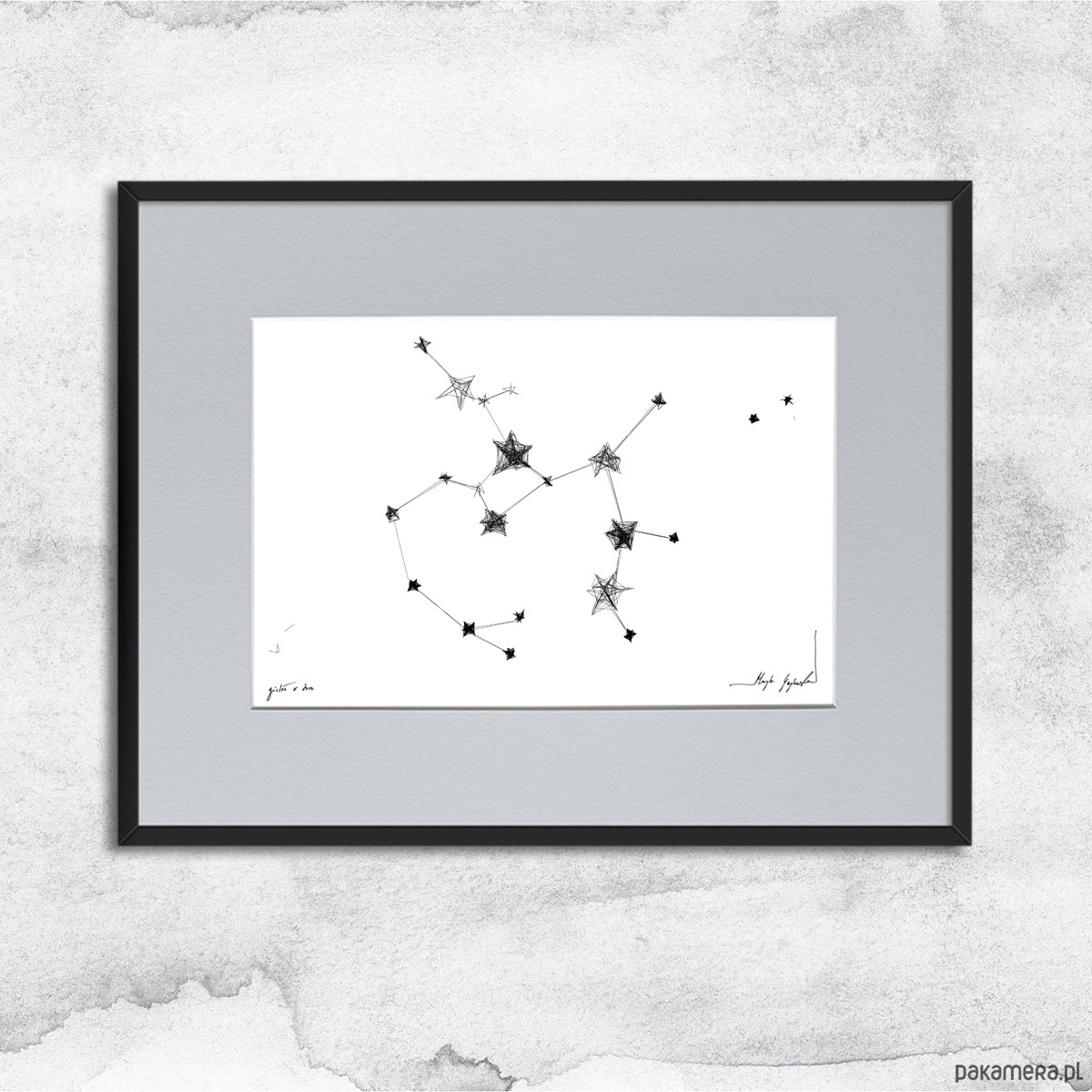 Grafika wykonana techniką mieszaną (giclée i rysunek isografem) na białym, matowym o lekko fakturowanej powierzchni, graficznym papierze Canson 250g. Pełne harmonii i symboliki czarno-białe grafiki ze znakami zodiaku będą oryginalnym prezentem na urodziny. Charakterystycznie kreślone konstelacje odnajdą się we współczesnych wnętrzach z dodatkami bieli, szarości czy grafitu.