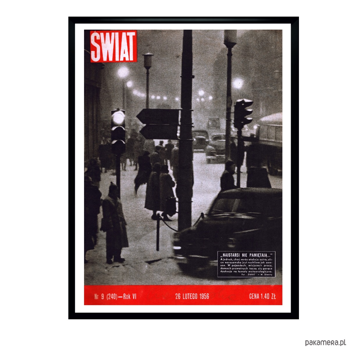 Ikoniczna okładka tygodnika „Świat” z 1956 roku, przedstawiająca zimową scenę uliczną w powojennej Warszawie. Nocny kadr uchwycony w miękkim, reportażowym świetle latarni tworzy sugestywny obraz miasta w okresie odwilży – codzienność mieszkańców, ruch uliczny, sylwetki pieszych i samochodów na ośnieżonej jezdni.
