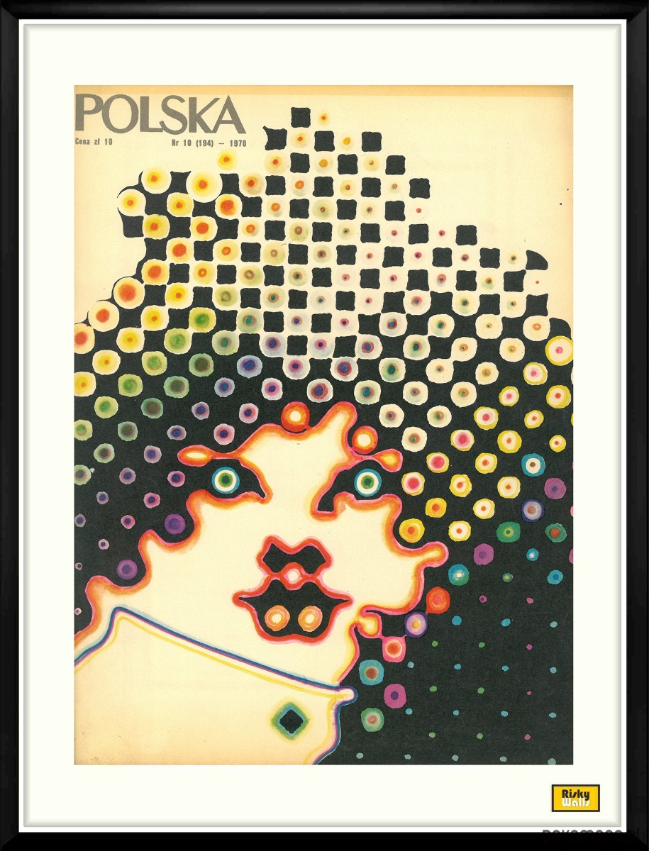 Oprawiona okładka miesięcznika POLSKA z października 1970 r, aut. Roman Cieślewicz, w czarnych ramkach o wymiarach 30 x 40 cm