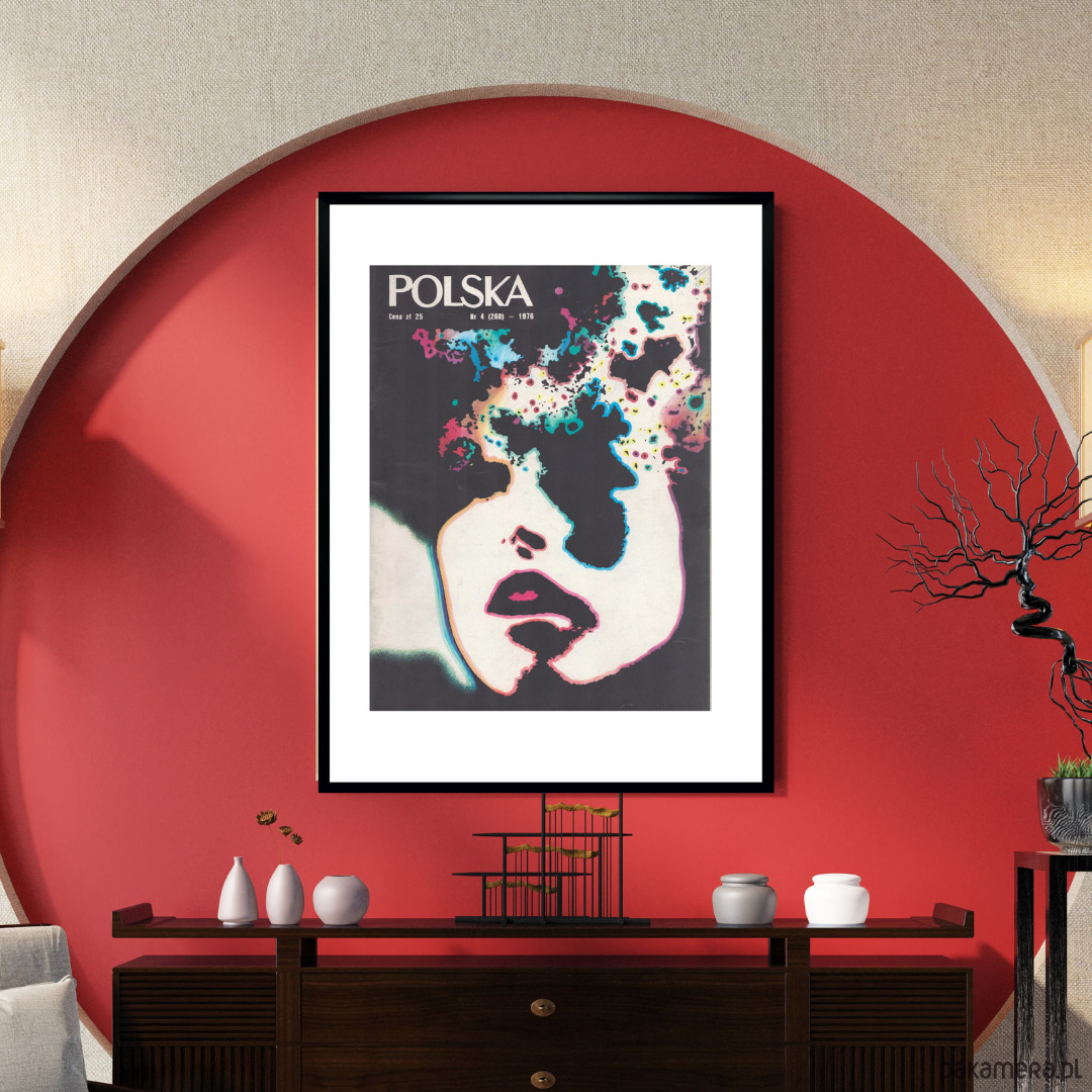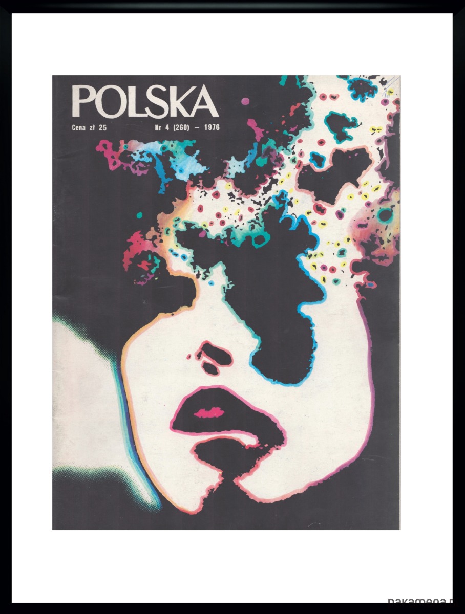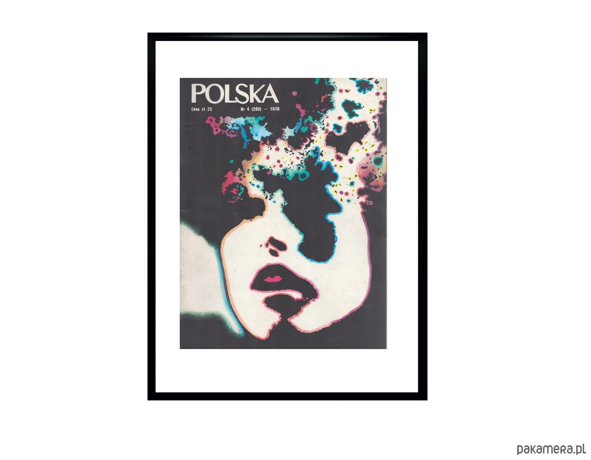Oprawiona okładka miesięcznika POLSKA z kwietnia 1976 r, aut. Roman Cieślewicz, w czarnych ramkach o wymiarach 30 x 40 cm