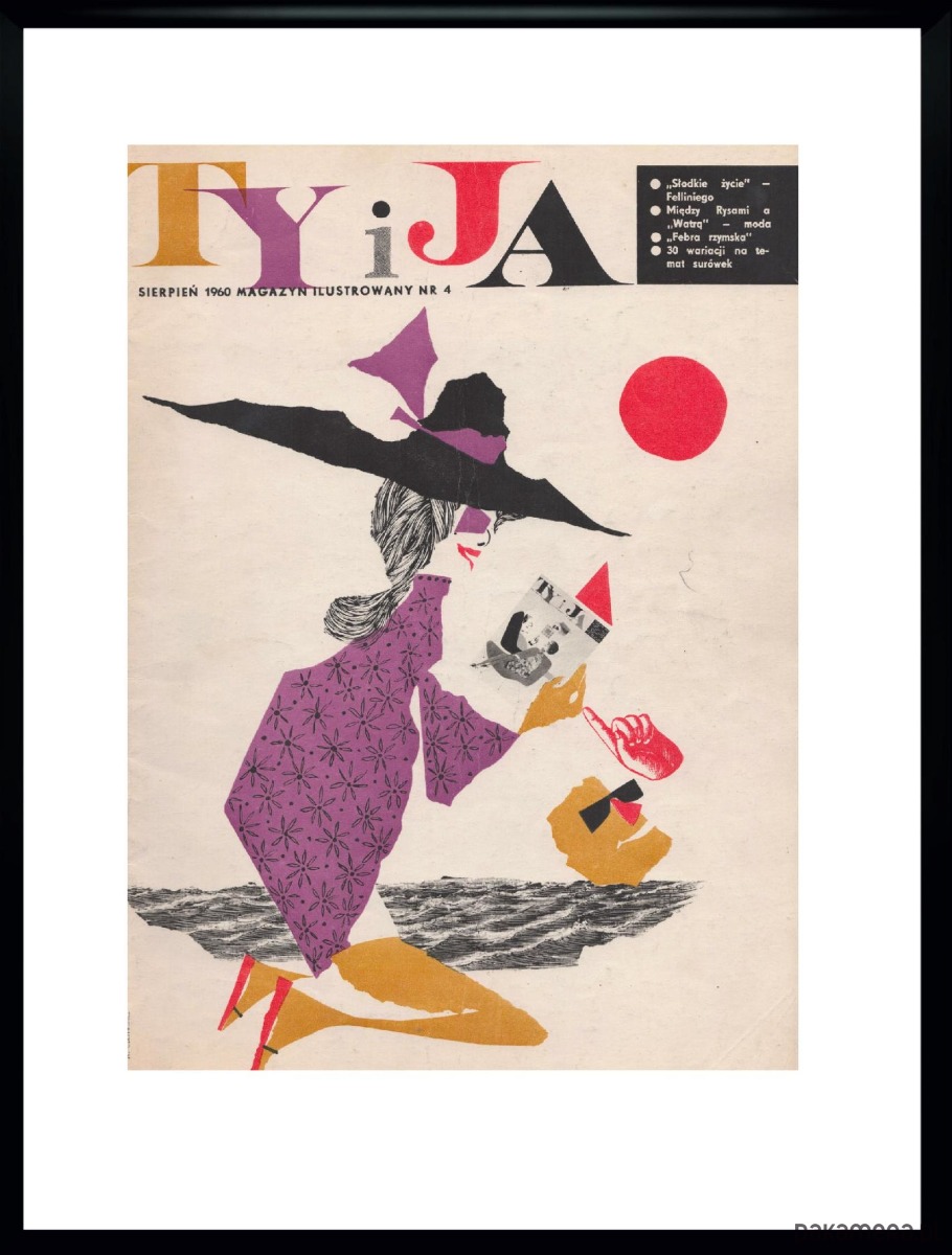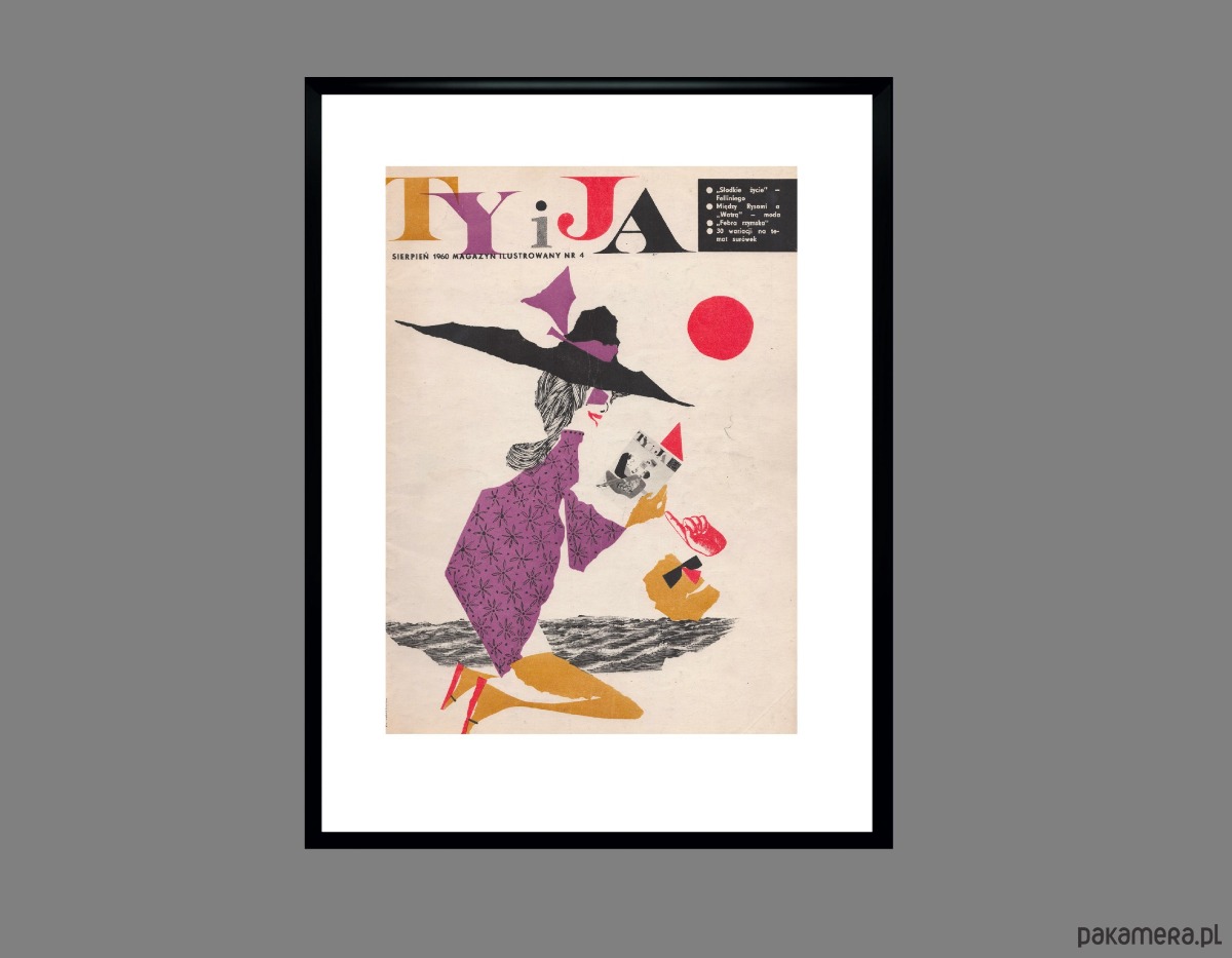Oprawiona okładka miesięcznika TY i JA z sierpnia 1960 r, aut. Roman Cieślewicz, w czarnej ramce o wymiarach 30 x 40 cm