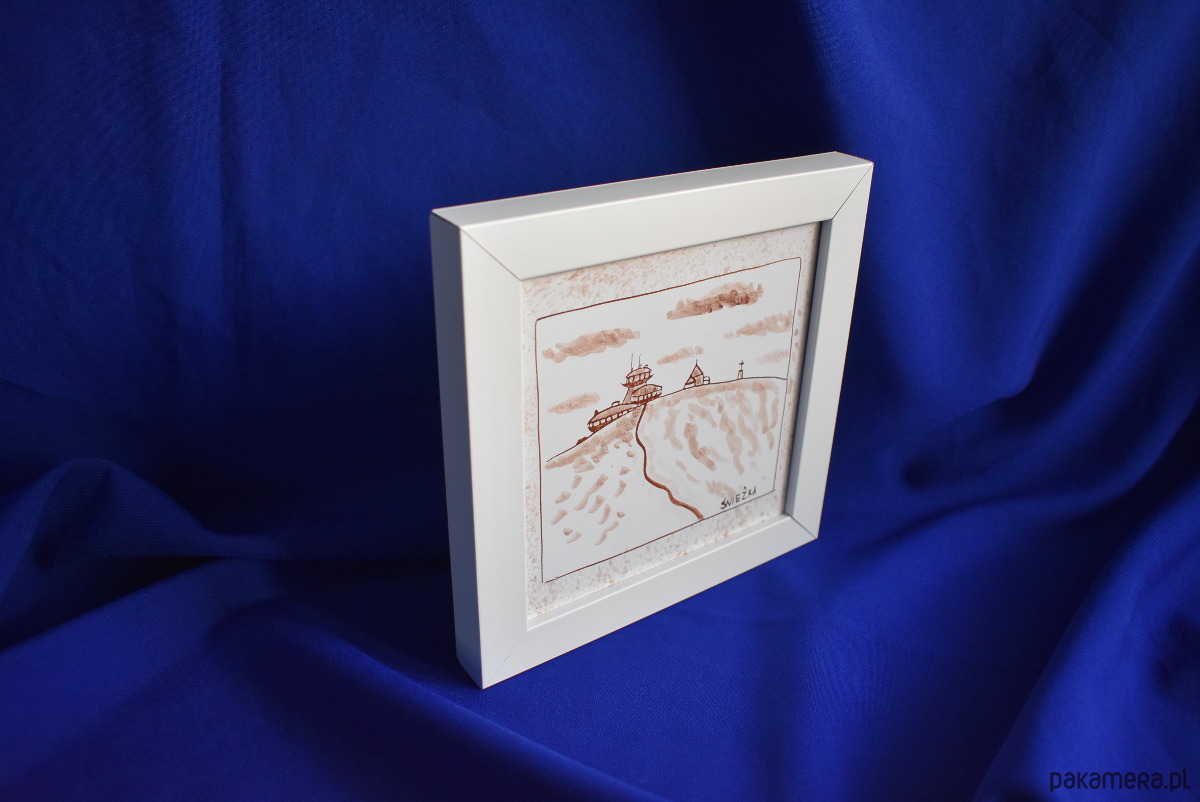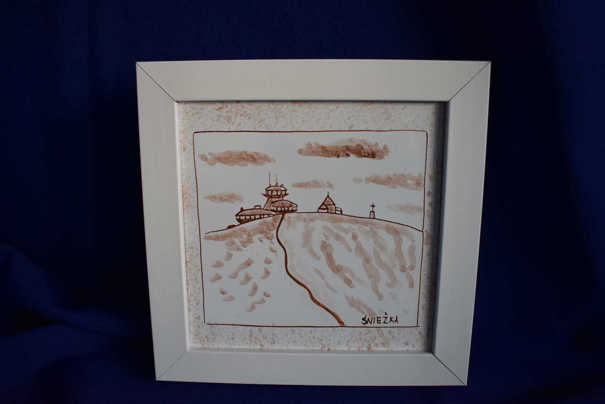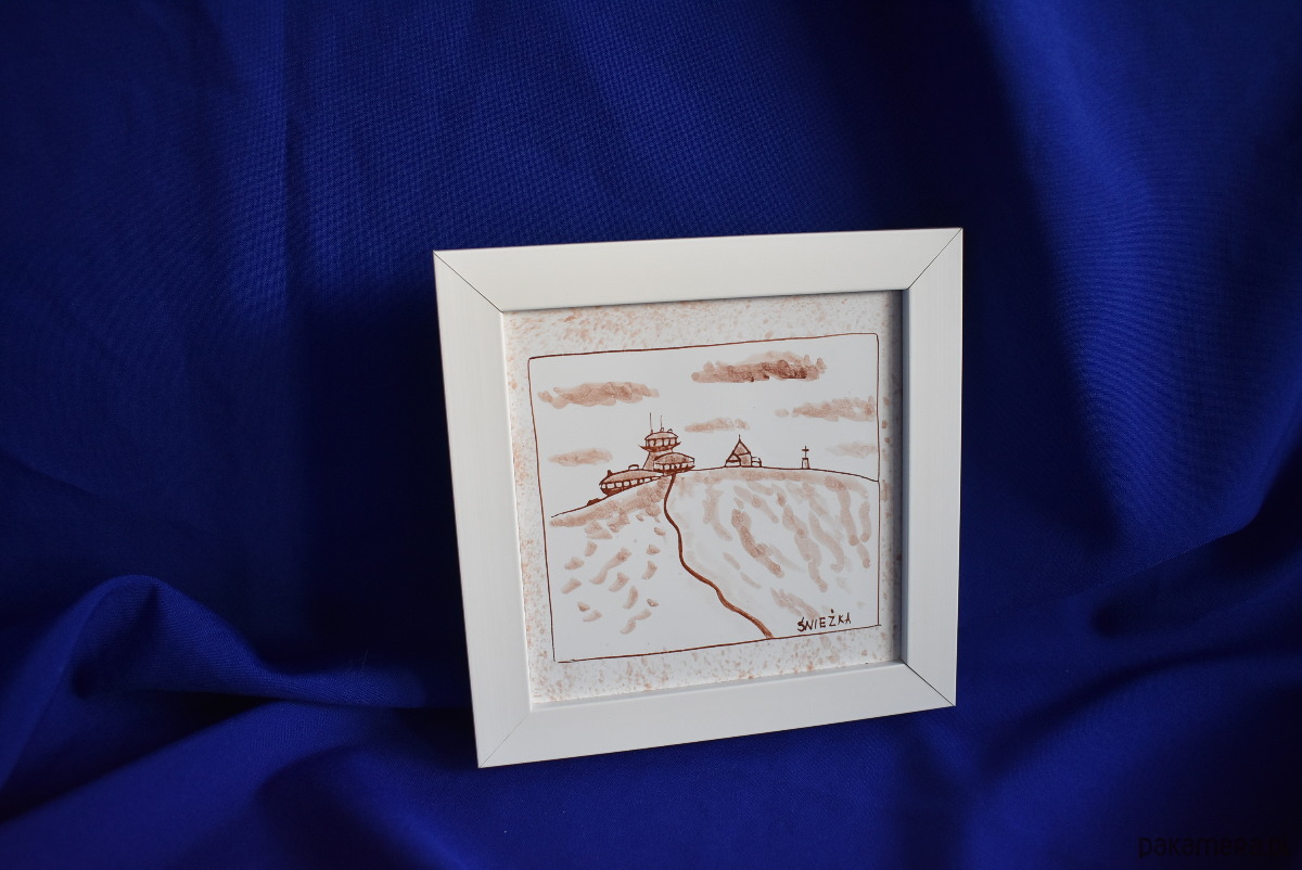 Wyjątkowy, ręcznie malowany kafelek przedstawiający szczyt Śnieżka, oprawiony w elegancką białą ramkę. To połączenie tradycyjnego rzemiosła z ponadczasową estetyką, które pięknie dopełni wnętrze domu lub będzie oryginalnym prezentem.