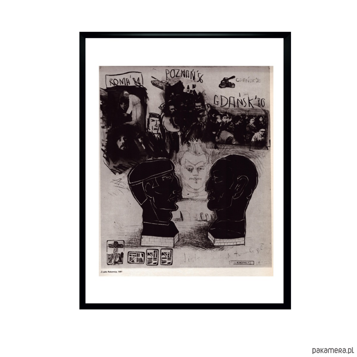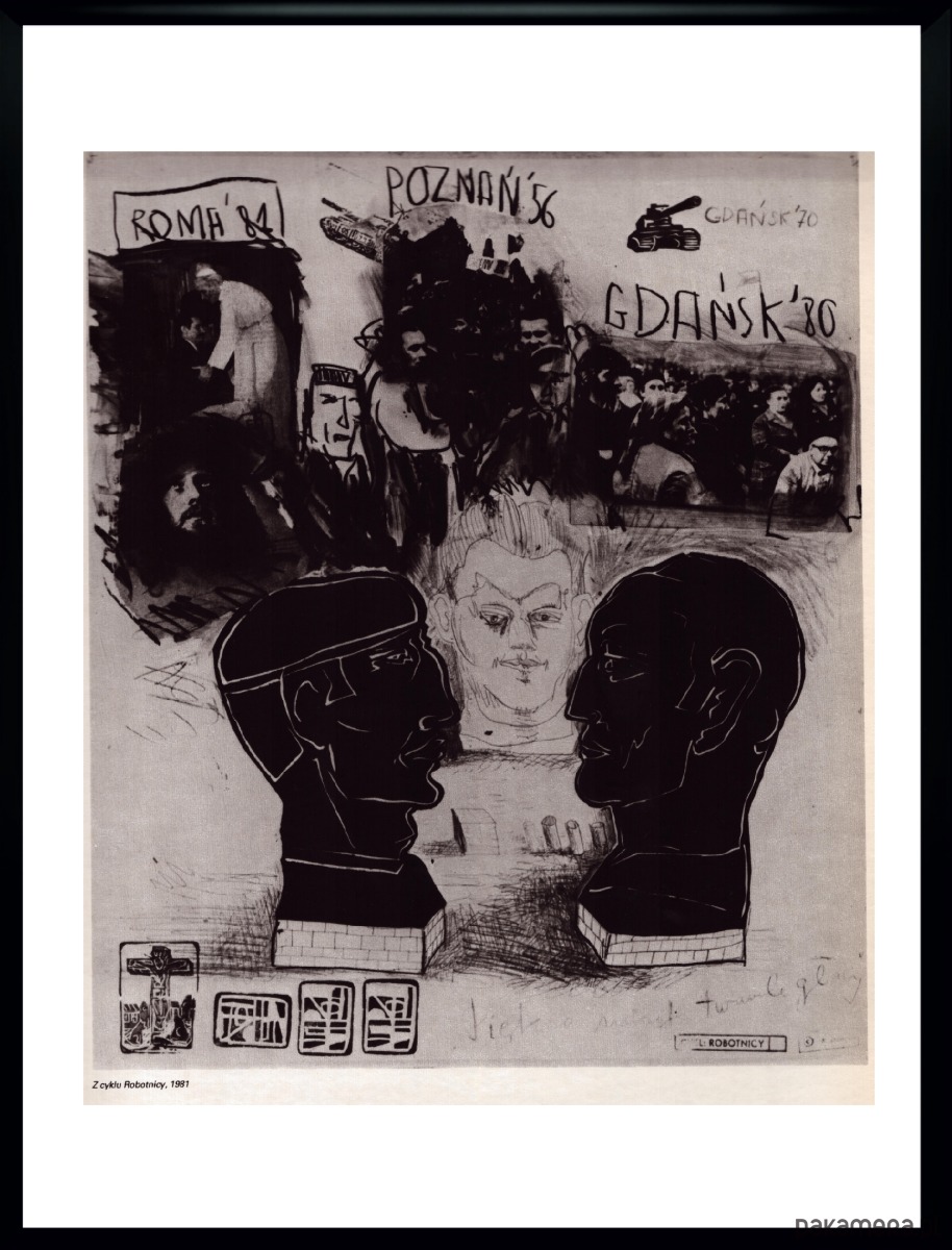 Oprawiony rysunek aut. E. Dwurnik z cyklu rysunków i kolaży "Robotnicy", 1981 r, w czarnych ramkach o wymiarach 30 x 40 cm. Reprint z magazynu z lat 80tych.