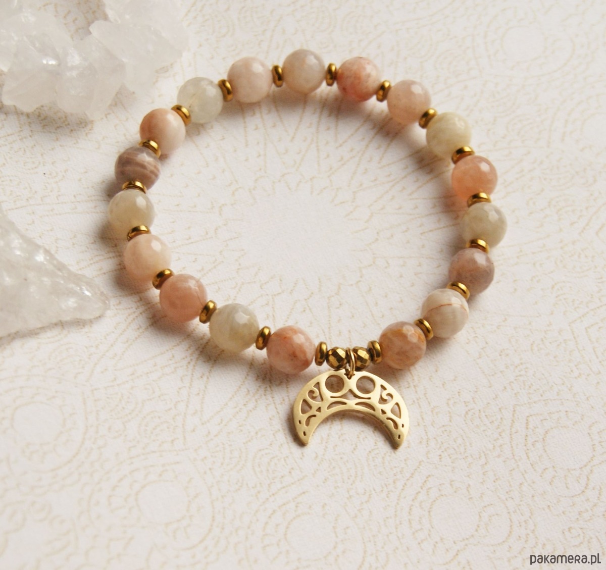 wykonana z wielobarwnych kul kamienia słonecznego w odcieniach cielistych (fasetowane kule 9mm), przekładek ze złotego hematytu, ażurowej zawieszki z pozłacanej stali szlachetnej (nie uczula!).