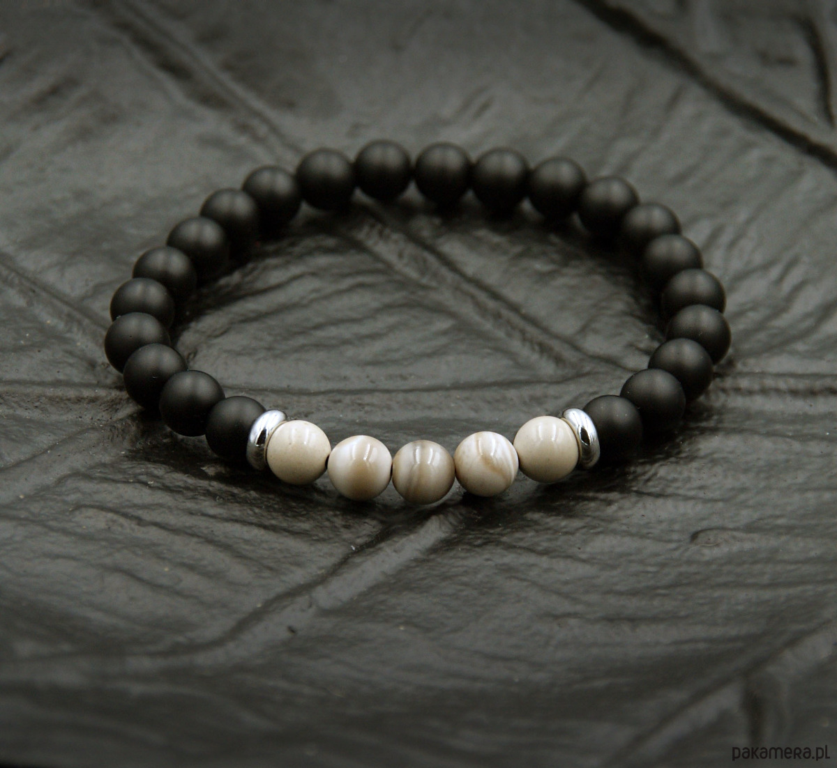 TUTAJ: niezwykle ciekawa bransoletka- talizman wykonana z matowego onyksu (8mm), krzemienia pasiastego (połysk, 8mm) , przekładek ze stali szlachetnej (nie uczula, kolor nie ściera się)