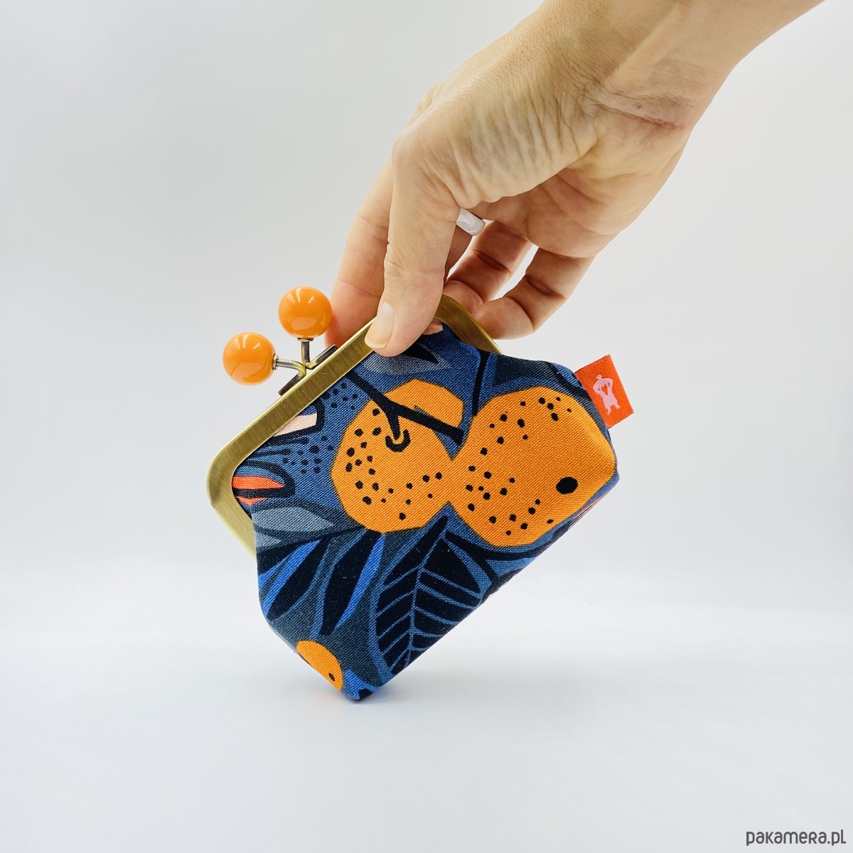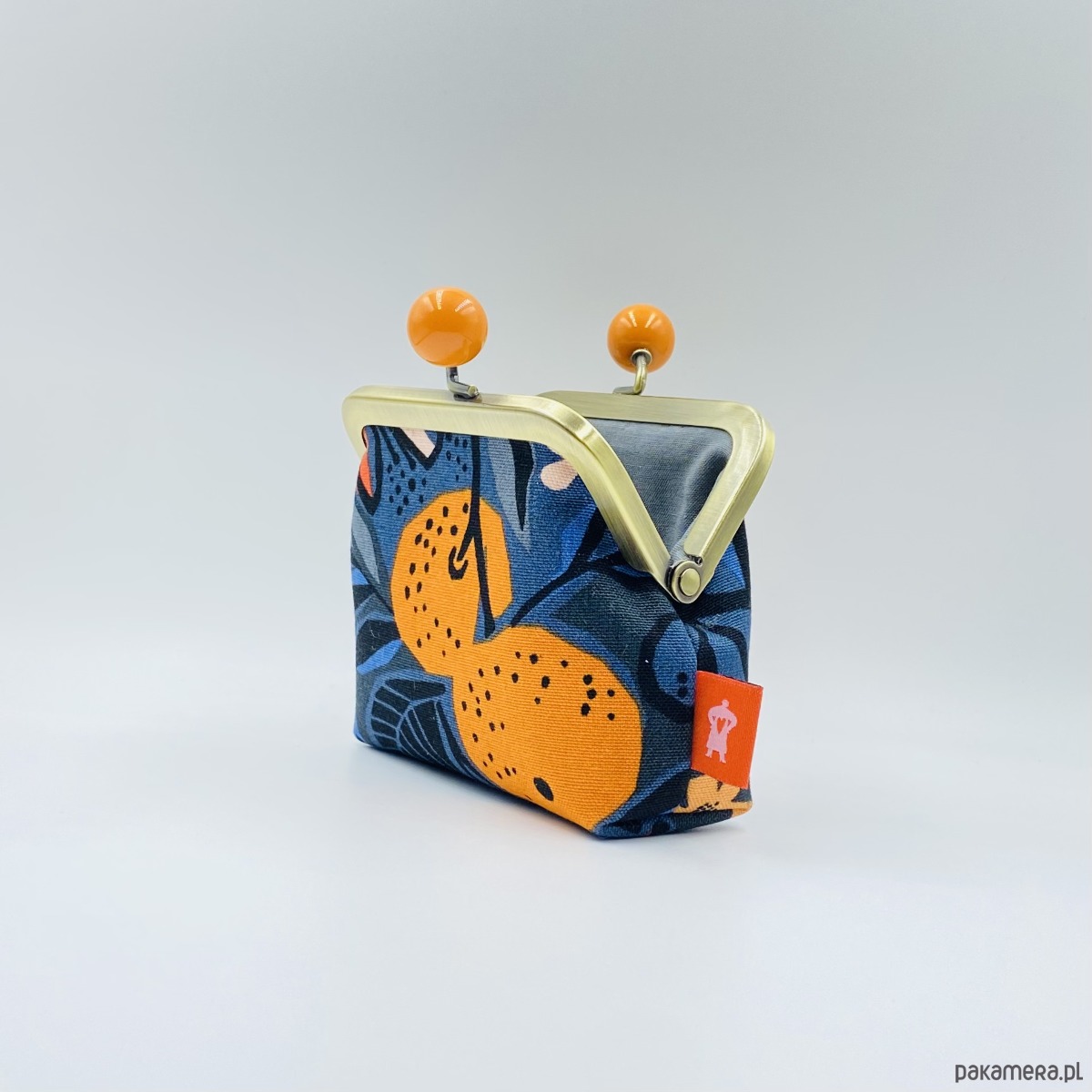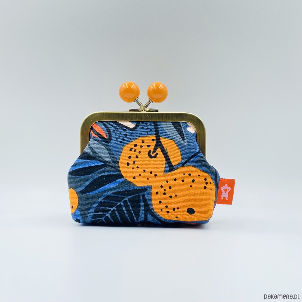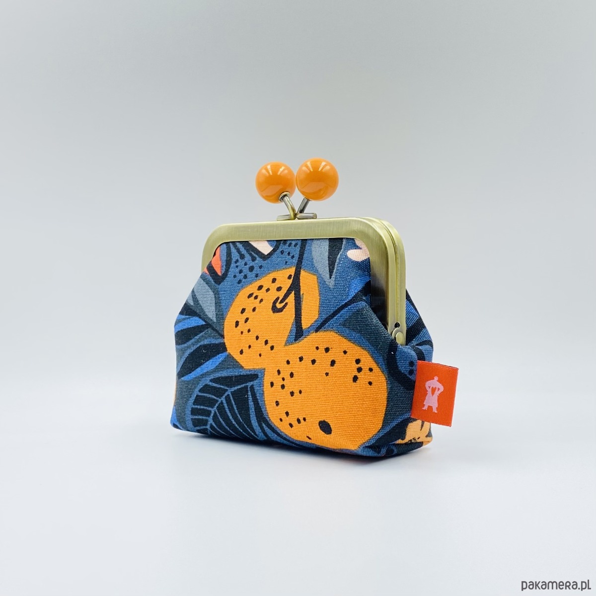 „Oranges”. Z zewnątrz - wzmocniona gruba bawełna z graficznym motywem pomarańczy, od wewnątrz bawełniana podszewka w jasnoszarym kolorze. Jednokomorowa portmonetka, która mieści w sobie karty kredytowe.