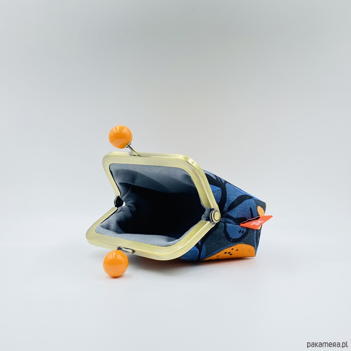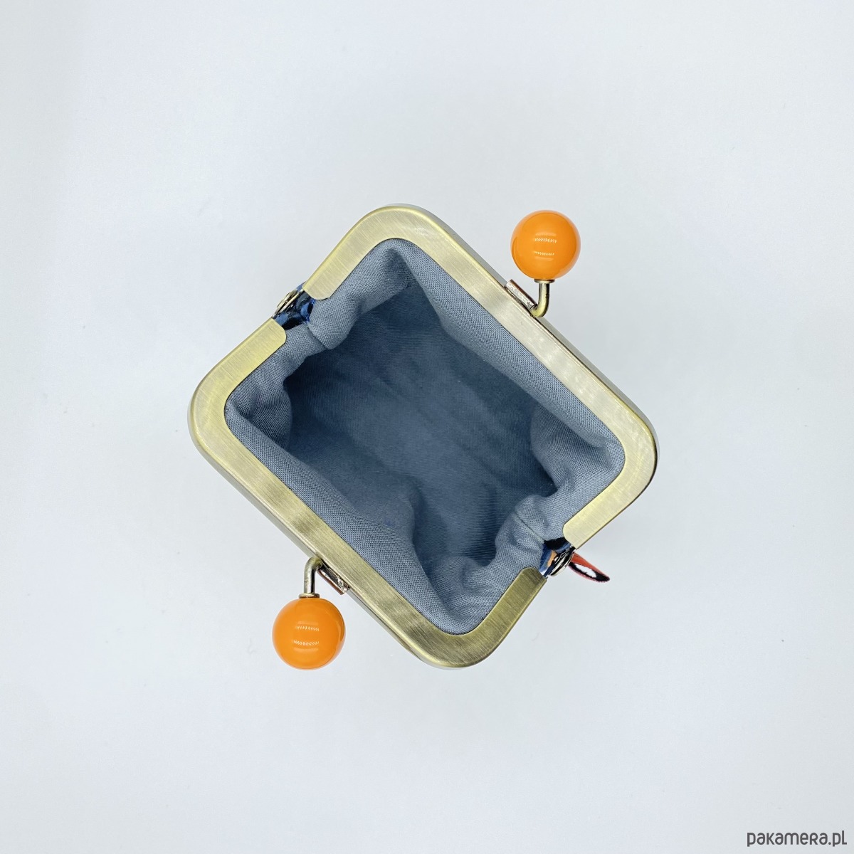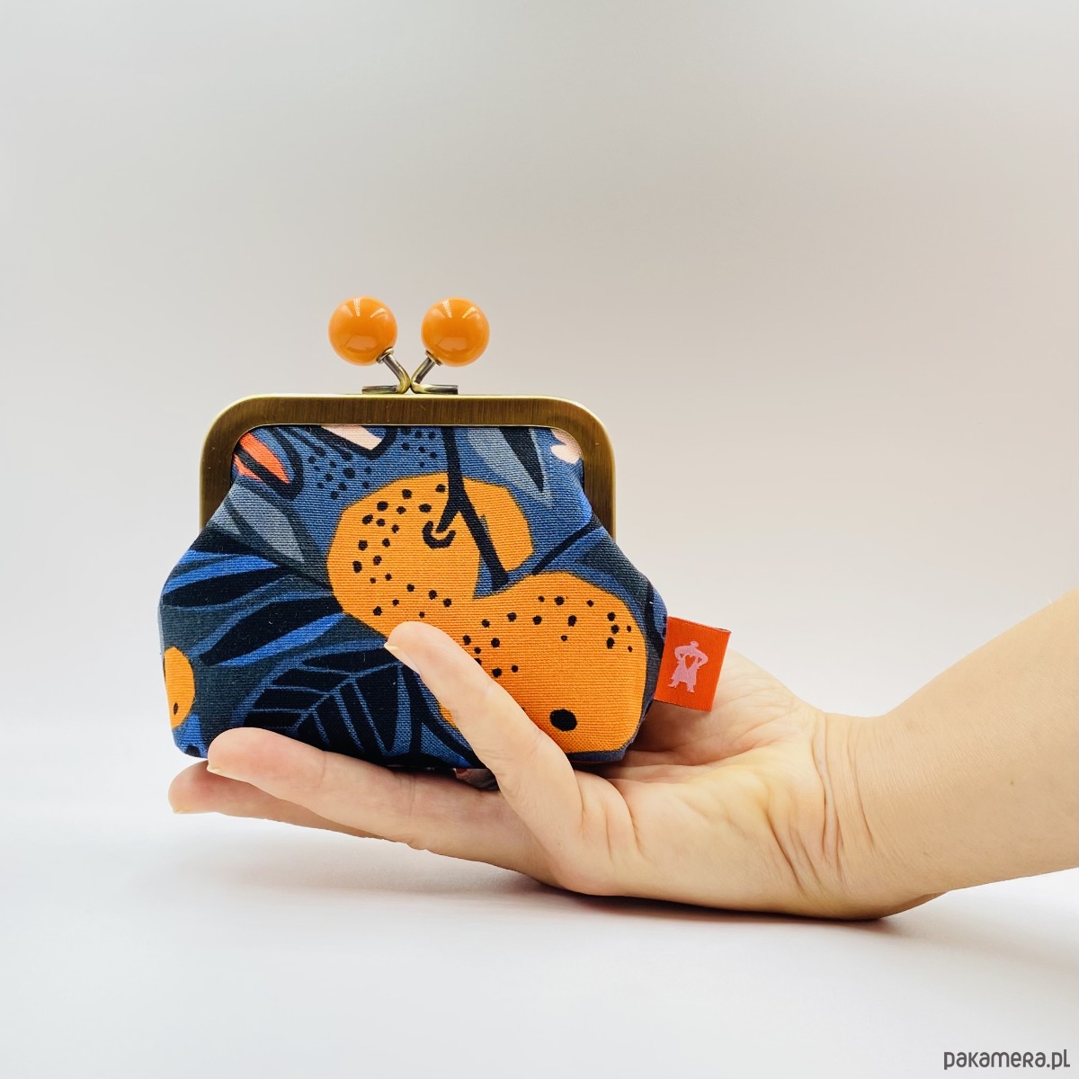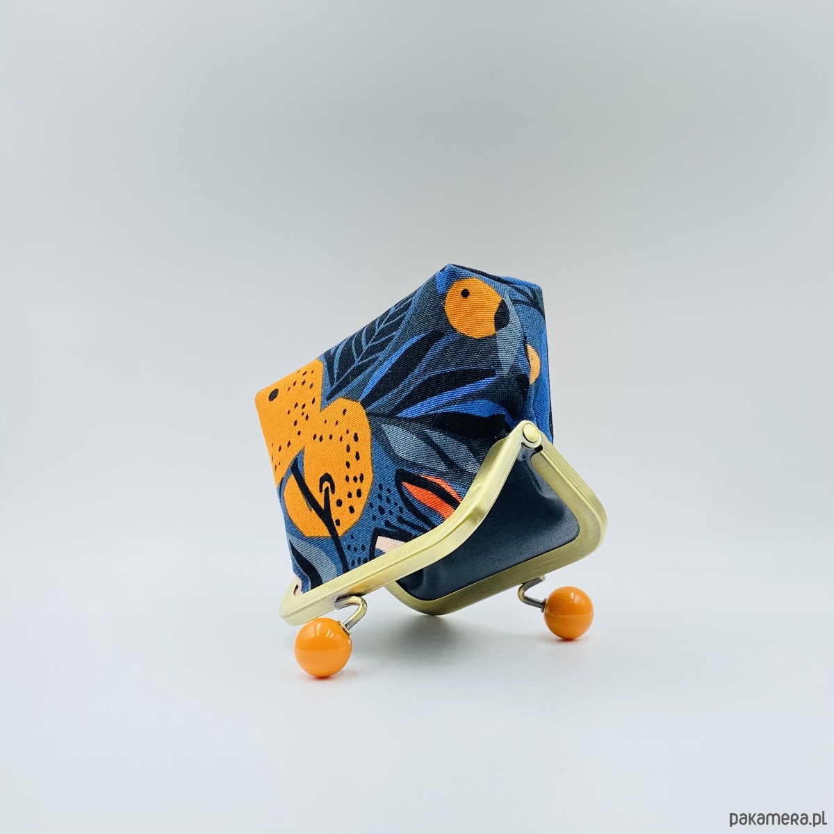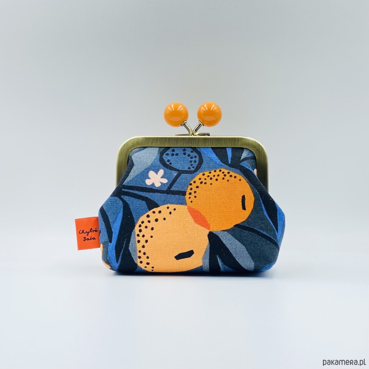 „Oranges”. Z zewnątrz - wzmocniona gruba bawełna z graficznym motywem pomarańczy, od wewnątrz bawełniana podszewka w jasnoszarym kolorze. Jednokomorowa portmonetka, która mieści w sobie karty kredytowe.