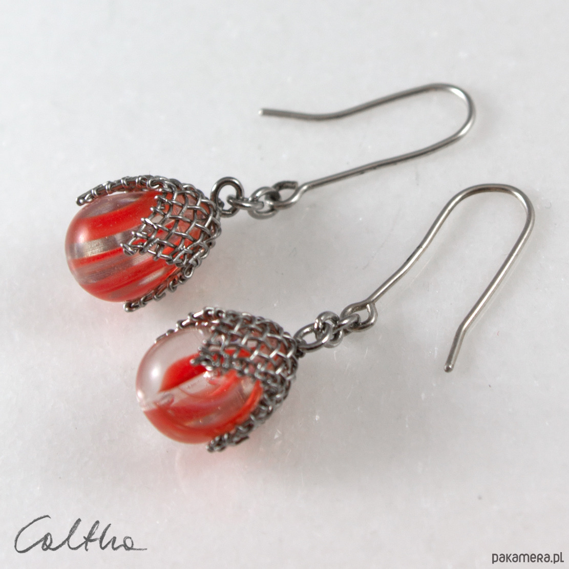 Szklane nieregularnie barwione krople w ręcznie wykonanej oprawie. Całkowita długość kolczyka to około 4 cm. Eleganckie srebrne zaczepy (dostępne również jako klipsy - znajdź w moim butiku lub zapytaj).
