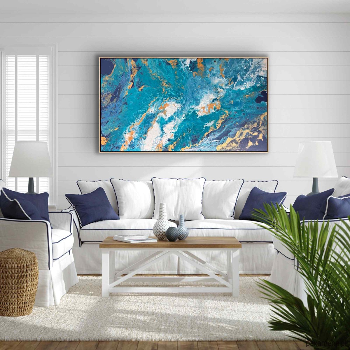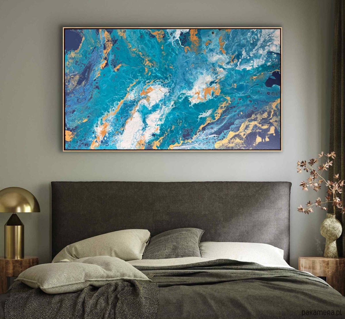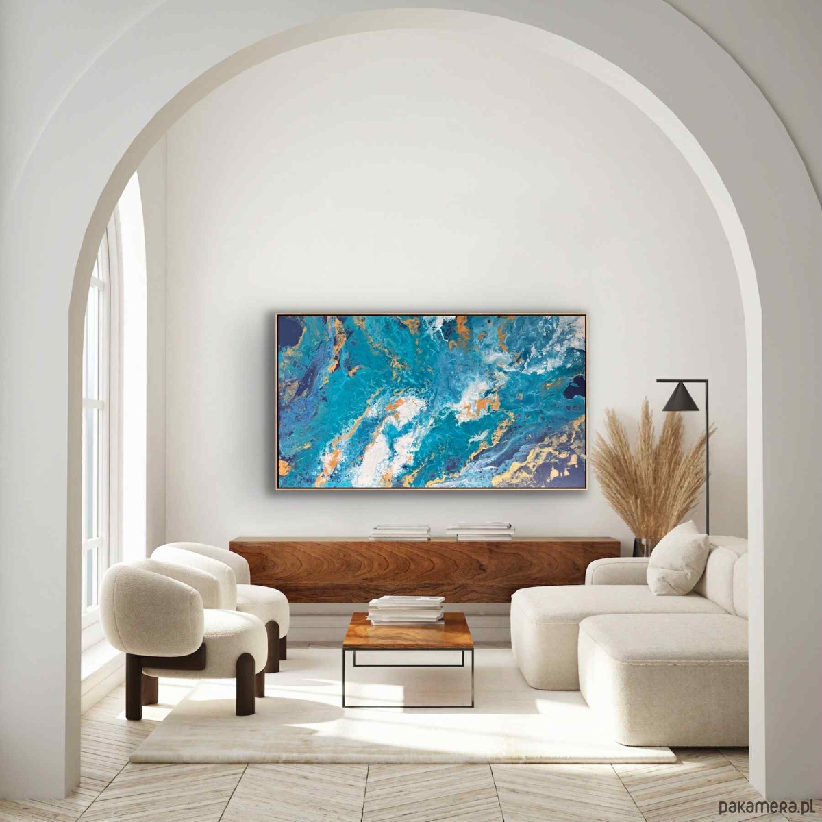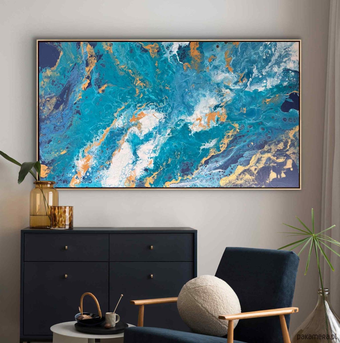 Obraz przyciąga wzrok swoją intensywną, żywą kolorystyką. Dominują w nim odcienie turkusu i błękitu, przełamane akcentami złota i bieli, co sprawia wrażenie ruchu i pulsującej energii – jakby patrzyło się na ocean widziany z lotu ptaka. Płynne przejścia barw i dynamiczne kontrasty wywołują uczucie lekkości, wolności i nieskończoności. Jest w tym dziele coś zarazem kojącego, jak i inspirującego – pozwala zatrzymać się na chwilę, a jednocześnie budzi wyobraźnię, otwierając przestrzeń do marzeń.