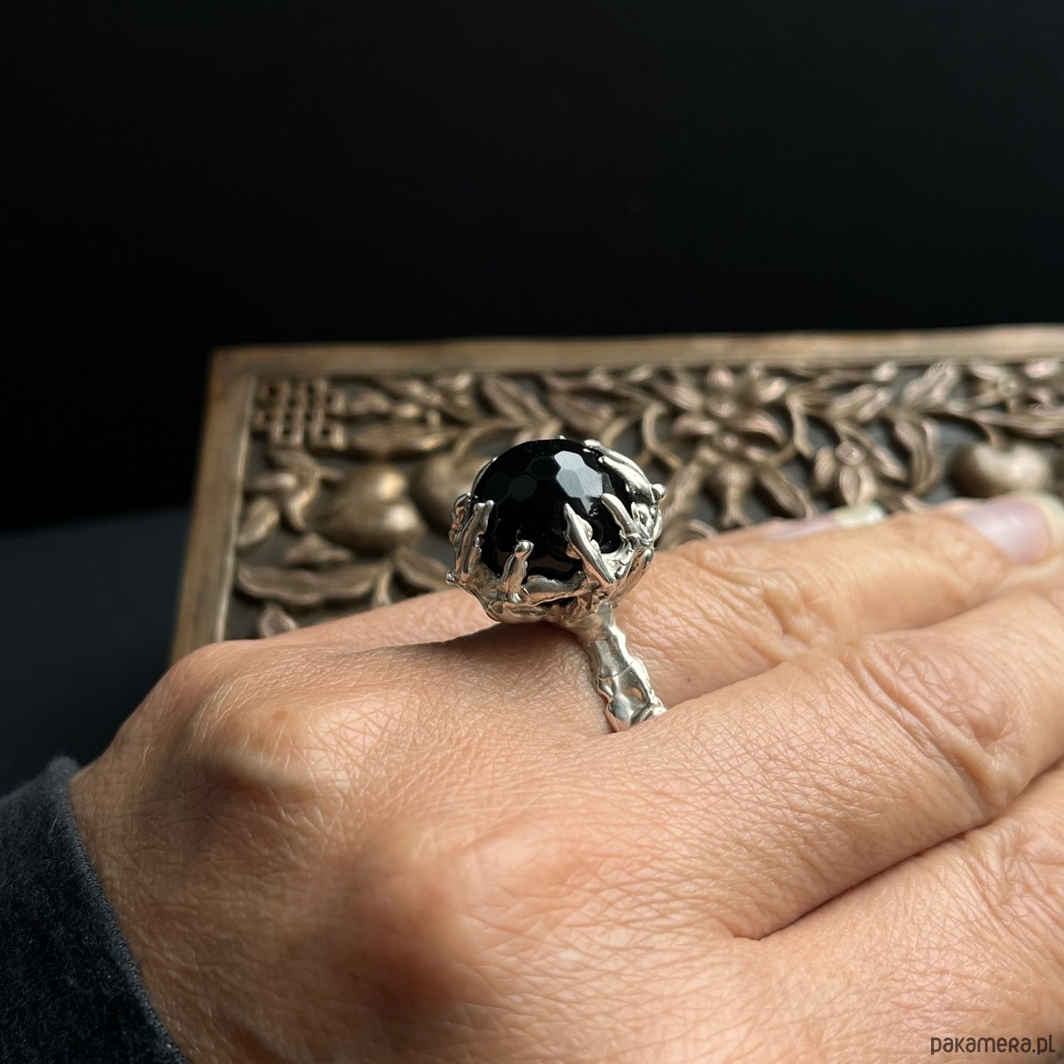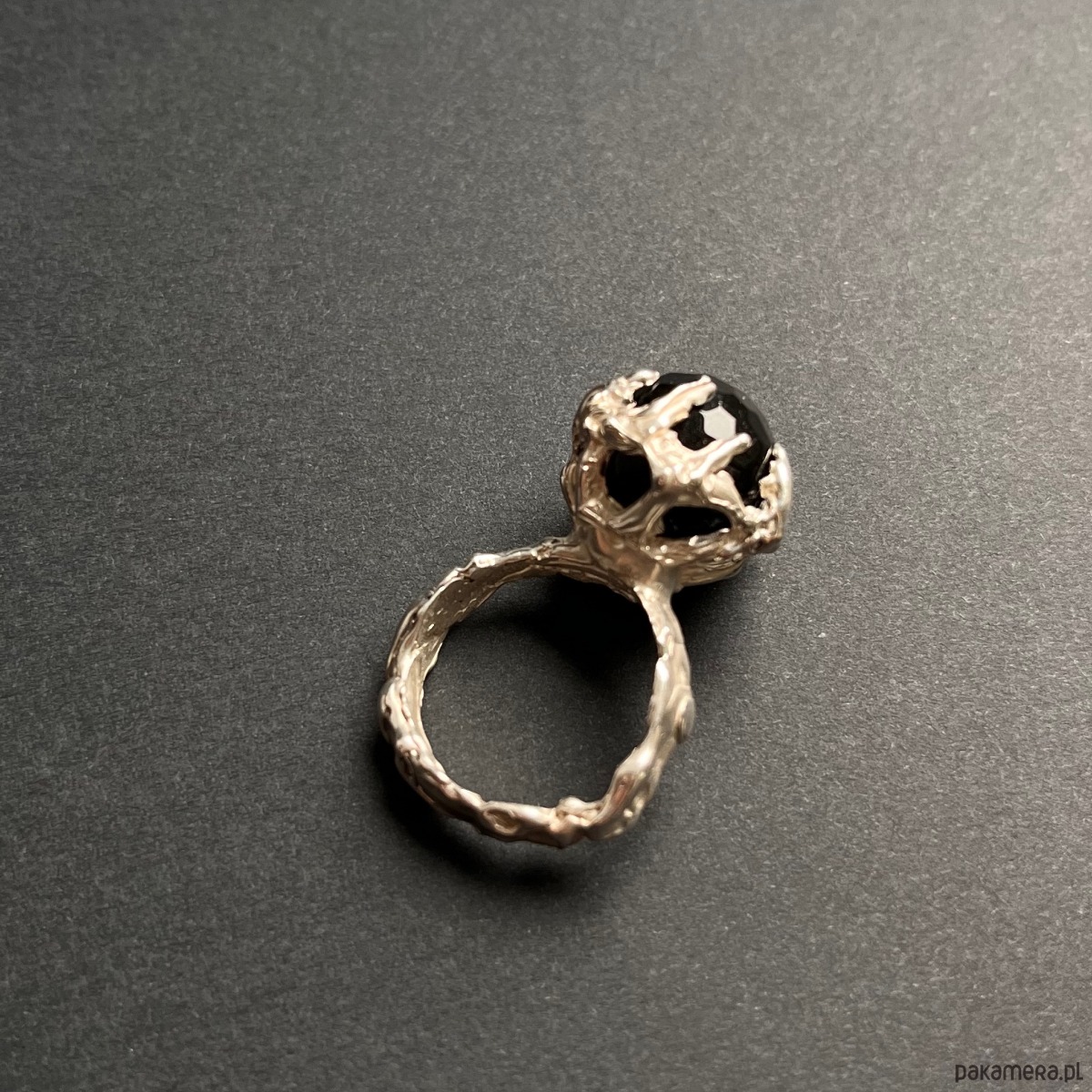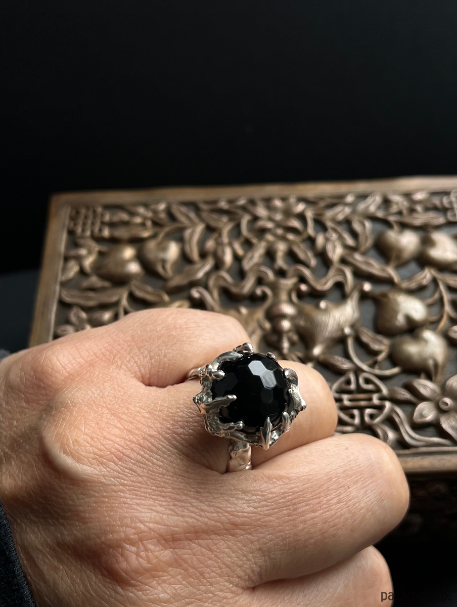 Niezwykły, zwracający uwagę pierścień z czarnym onyksem wykonany w pojedynczym egzemplarzu w srebrze błyszczącym.