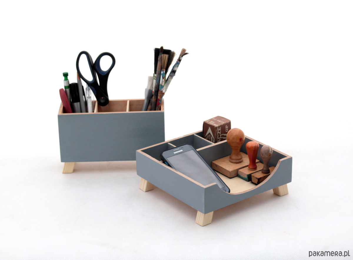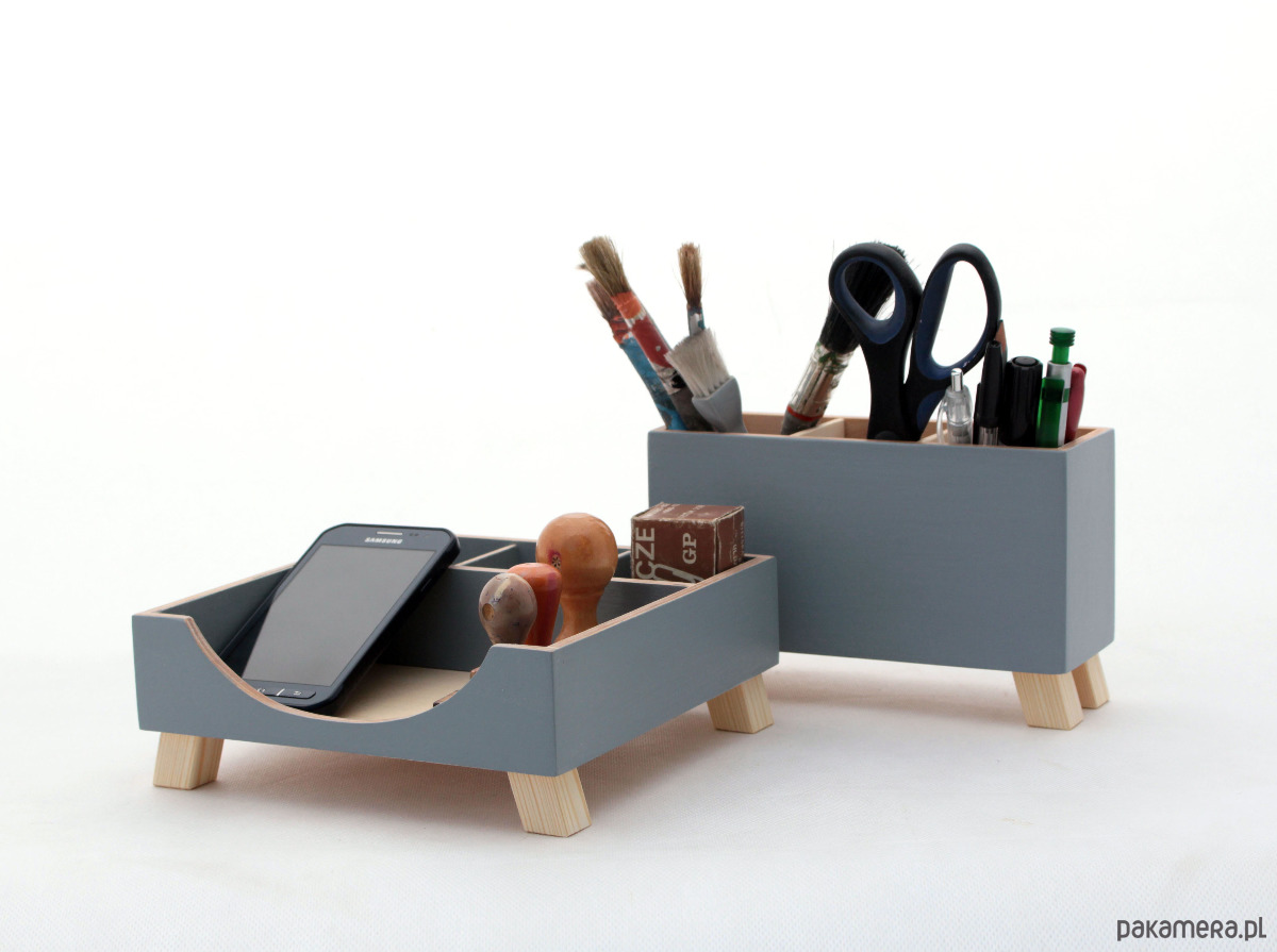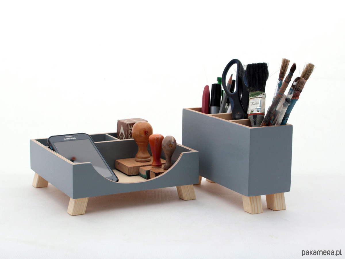 Zestaw dwóch przyborników do organizacji biurka. W całości wykonany ze sklejki drewnianej i pomalowany farbami akrylowymi. Jest stworzony, aby zapewnić Ci funkcjonalne rozwiązanie dla wszystkich małych przedmiotów na biurku.