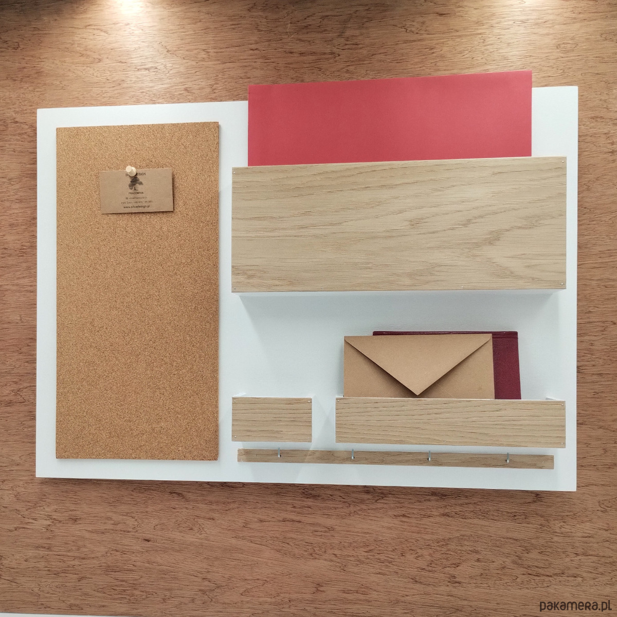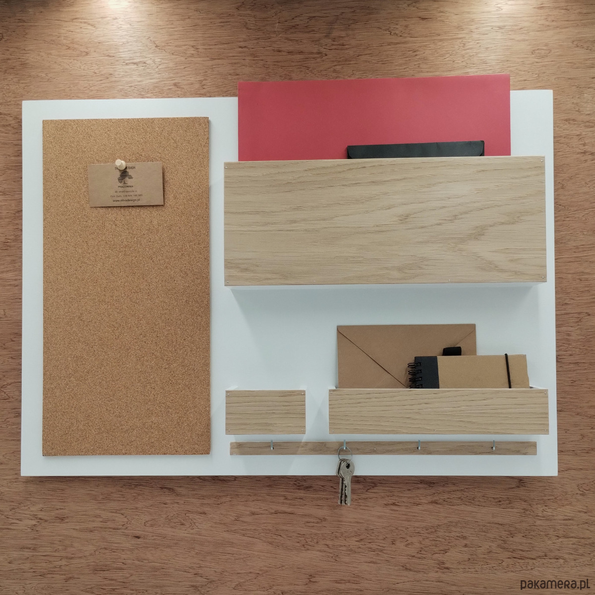 Praktyczny organizer wykonany od podstaw przez polską pracownie zawiera: dużą przegrodę na materiały formatu A4, dwie mniejsze przegrody (na ulotki, koperty, wizytówki...), tablicę korkową oraz 4 haczyki na klucze.