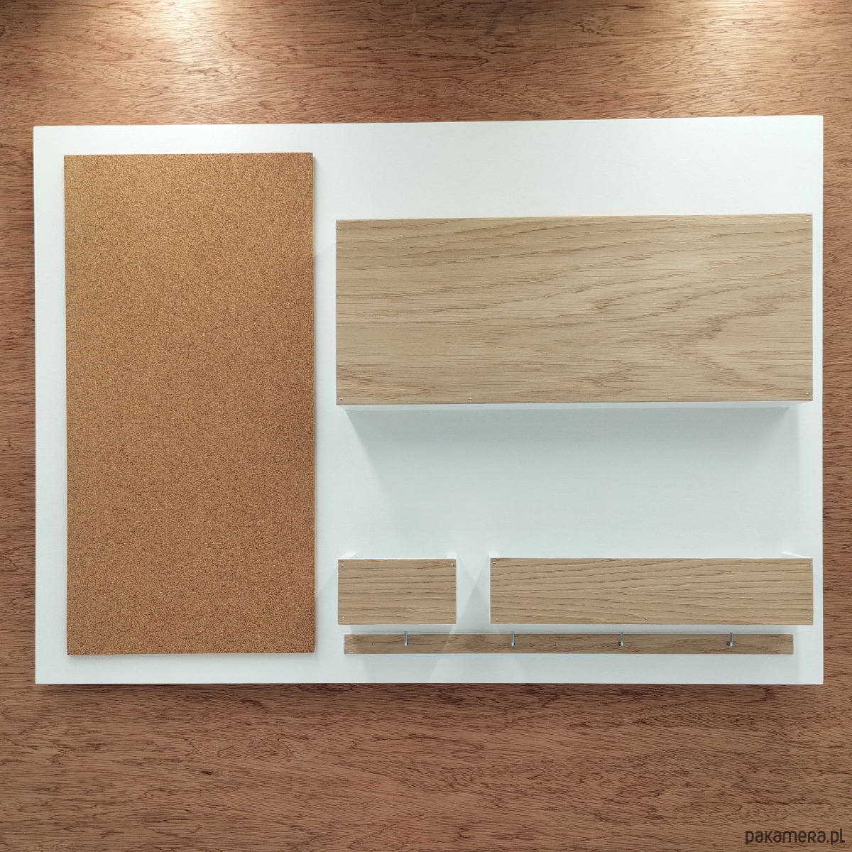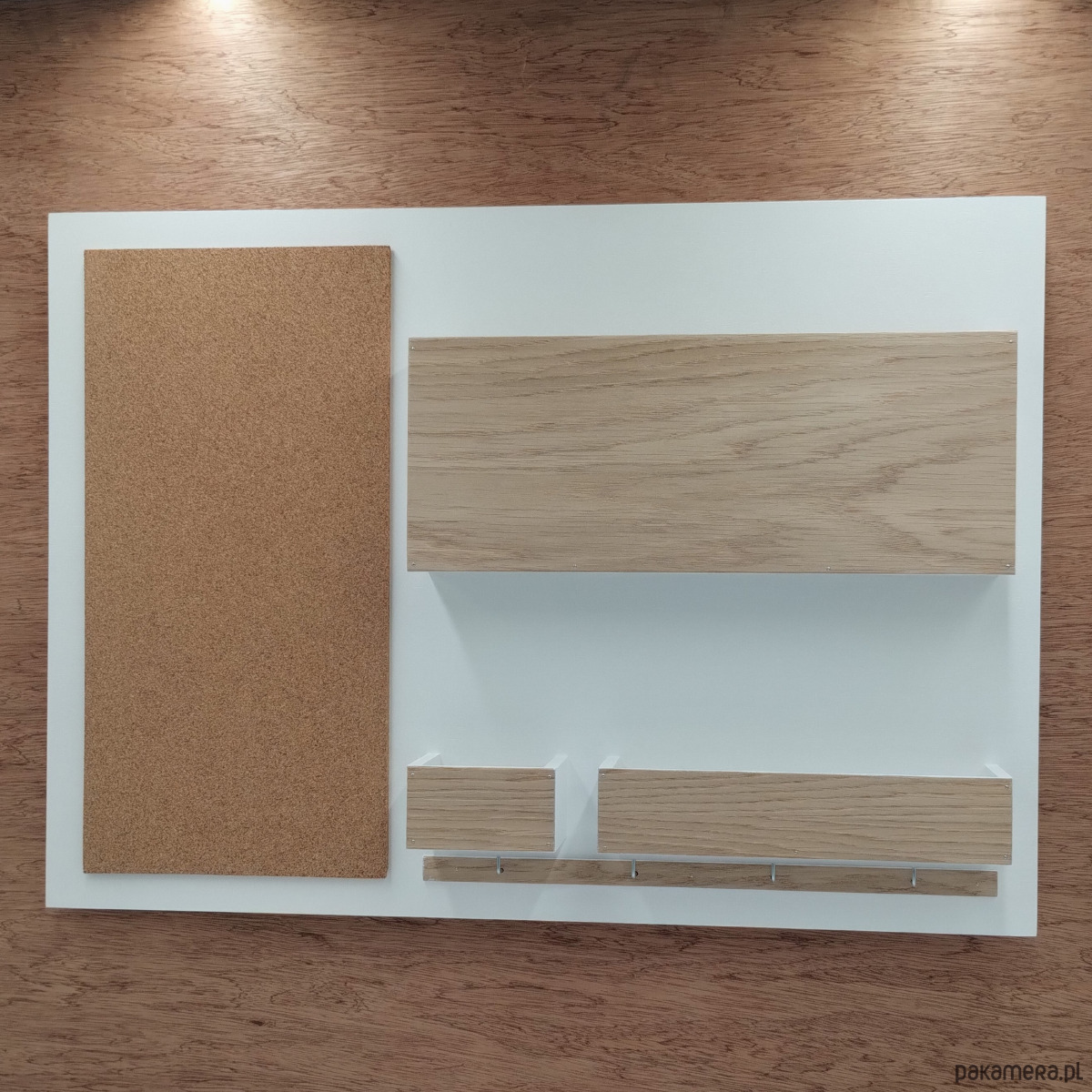 Trzy przegródki, tablica korkowa, rząd czterech haczyków.