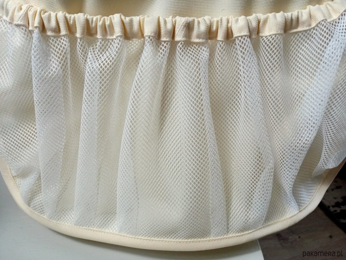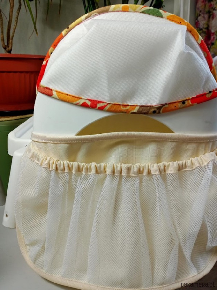 Organizer jest wykonany z tkaniny wodoodpornej w kolorze ecru a kieszonka z białej siatki. Możesz wrzucić do niego ściereczkę do wytarcia buzi po posiłku, śliniaczek, butelkę z piciem czy co tam jeszcze jest Ci potrzebne . Po bokach są pętelki do zamocowania. Ja zamocowałam go na guzikach przyszytych do wkładki. Jeśli Kupujesz w komplecie z wkładką i sobie życzysz, abym je ( guziki ) przyszyła, napisz do mnie. Oczywiście zrobię to gratis :) Możesz również sama to zrobić .