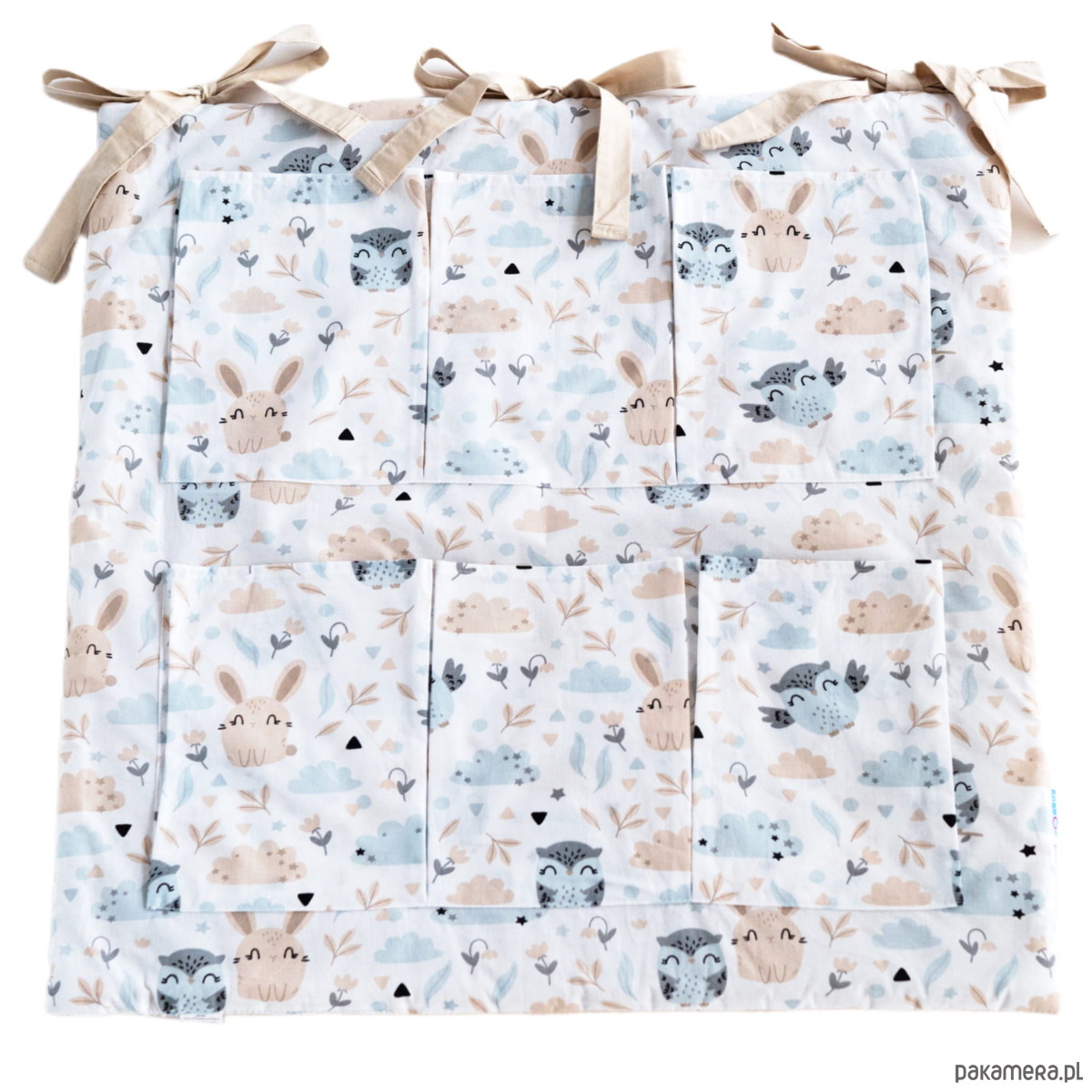 Organizer BabyU wyposażony jest w 6 praktycznych, pojemnych kieszeni, w których pomieścisz wszystkie niezbędne akcesoria, kosmetyki, pieluszki czy zabawki. Mocowanie odbywa się za pomocą ozdobnych troczków, wiązanych na estetyczne kokardki do ramki łóżeczka, które utrzymują organizer na miejscu.