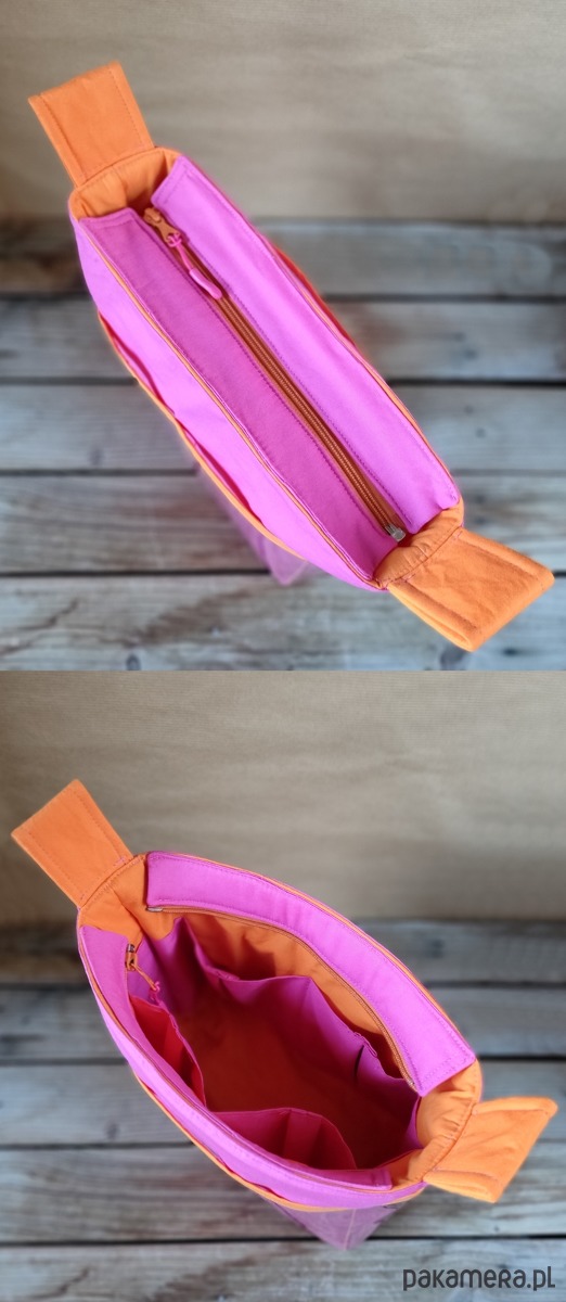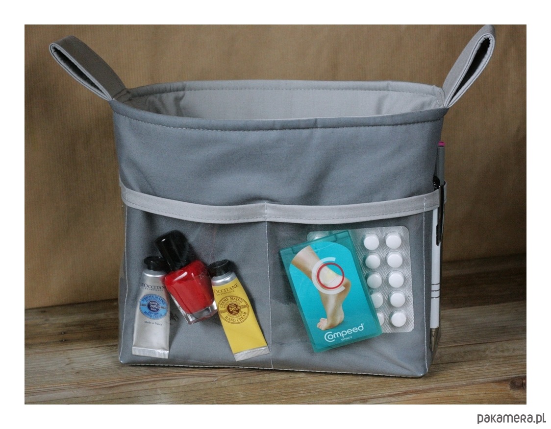 Organizer do torebki pomoże uporządkować wszystko co w niej jest luzem :). Różne rodzaje kieszonek do których można włożyć kosmetyki, leki, klucze, telefon, długopisy, a na środku miejsce na notes, portfel, wodę itp. Zewnętrzne kieszonki są z przeźroczystej folii. Z folii również jest dno, a więc jest łatwy do czyszczenia. W środku posiada 4 większe kieszonki ( z zaszewkami zwiększającymi miejsce) i 4 wąskie np. na klucze czy długopisy. Uszyty jest z bawełny, folii, a w środku dodatkowo posiada sztywną ocieplinę, żeby lepiej trzymał kształt. Posiada uszy do łatwiejszego wyciągania z torebki.